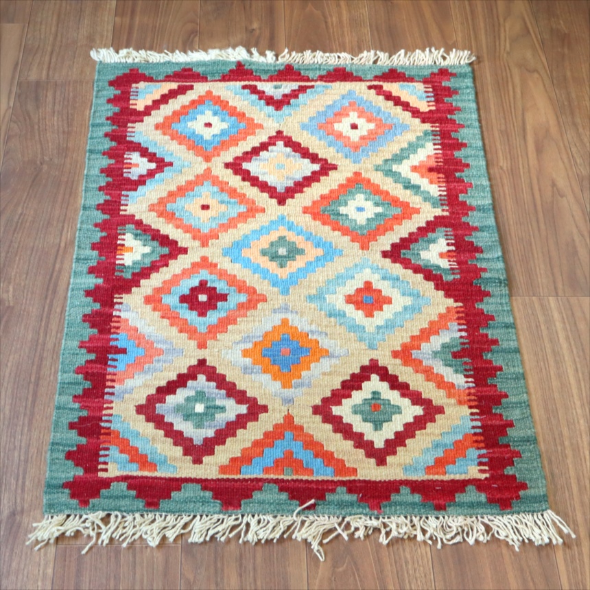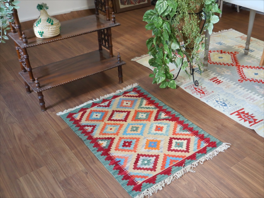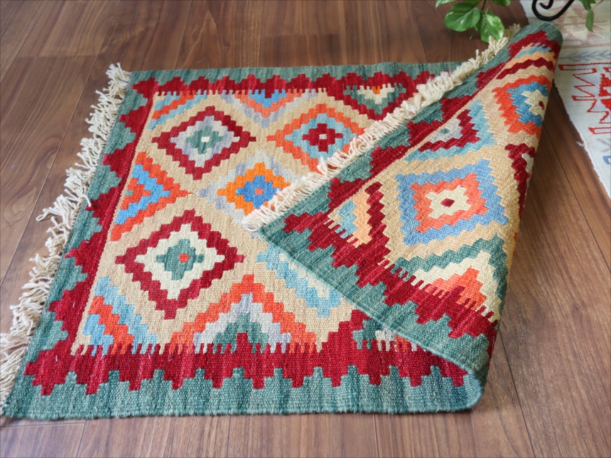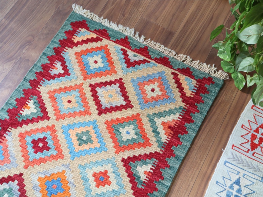 6-7mm程度の厚みがあり、パイル(毛足)がない平織りの敷物で表面は少しザラっとした肌ざわりです。織り手の自由なアイデアでデザインされていますので、左右対象でなかったり、モチーフが少しずれていたりということもありますが、世界で一枚だけの作品ですからその点はご了承ください。