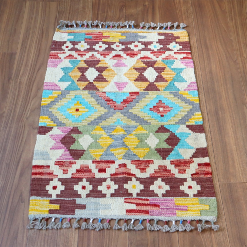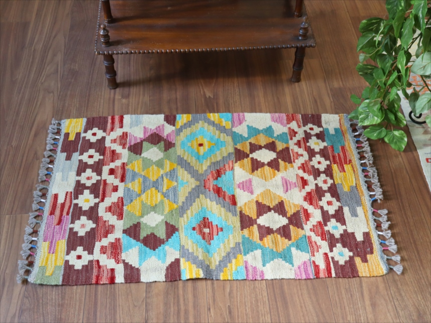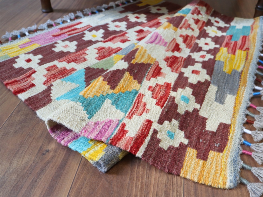 カシュカイ族のデザインですが、アフガンで織られたとされるキリムです。彩度の高いポップな色使いが特徴。モチーフの配列は比較的整っていますが、角の部分は額縁のパターンがずれていて、、手織りのおおらかさも感じられます。