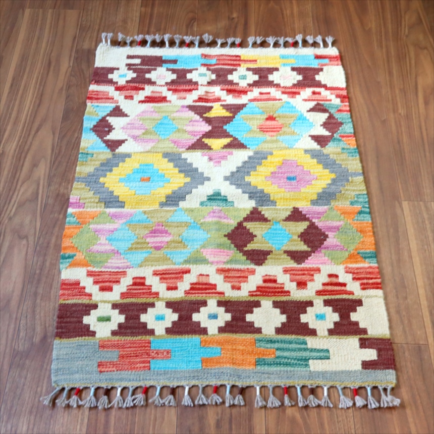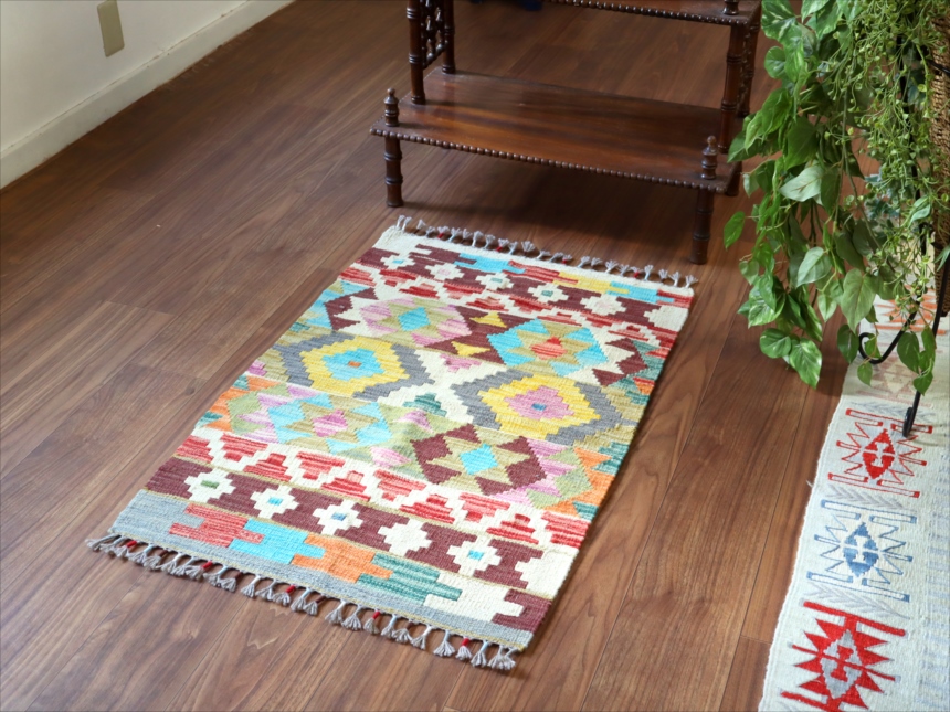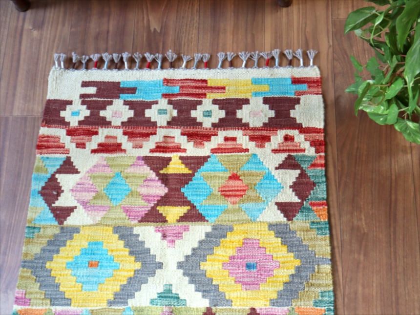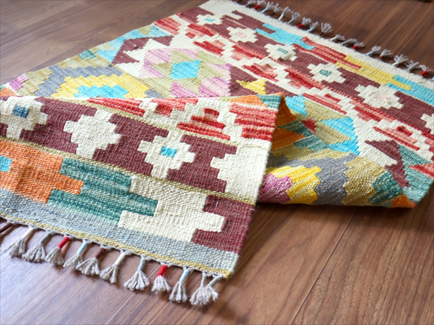カシュカイ族のデザインですが、アフガンで織られたとされるキリムです。彩度の高いポップな色使いが特徴。モチーフの配列は比較的整っていますが、角の部分は額縁のパターンがずれていて、、手織りのおおらかさも感じられます。