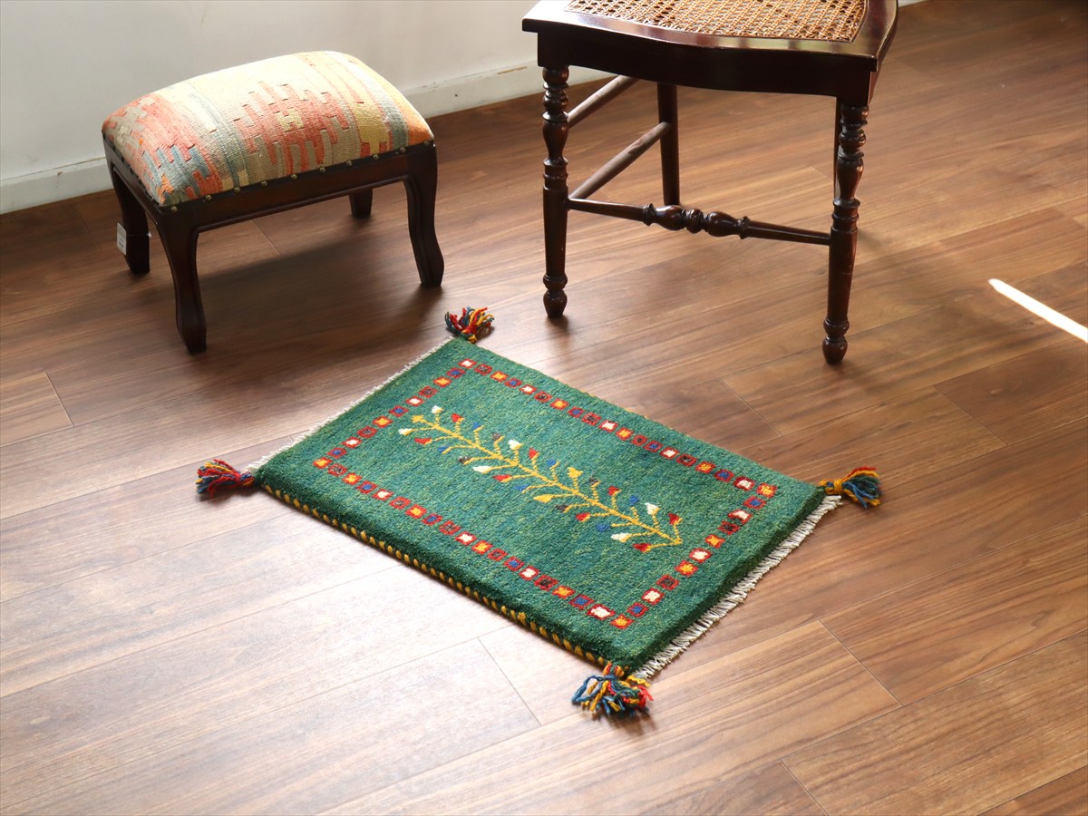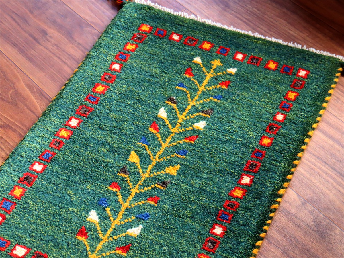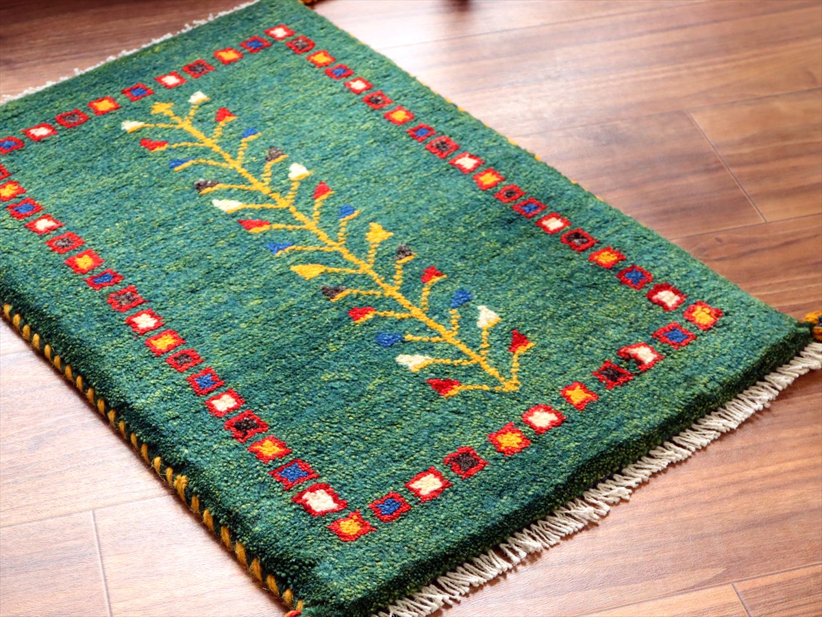 ギャッベ ミニギャベ イラン手織り58×40cmグリーン 連なる生命とカラフルタイル