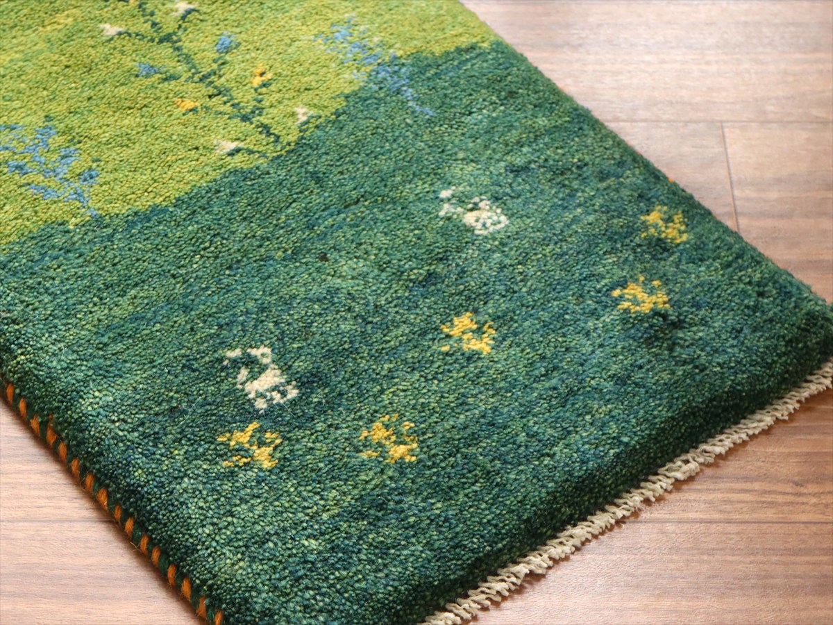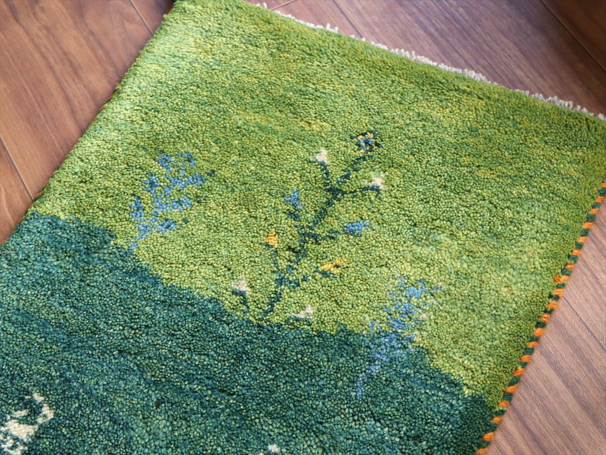 グリーンの丘に4動物と生命の樹が織られた風景画のギャッベ。