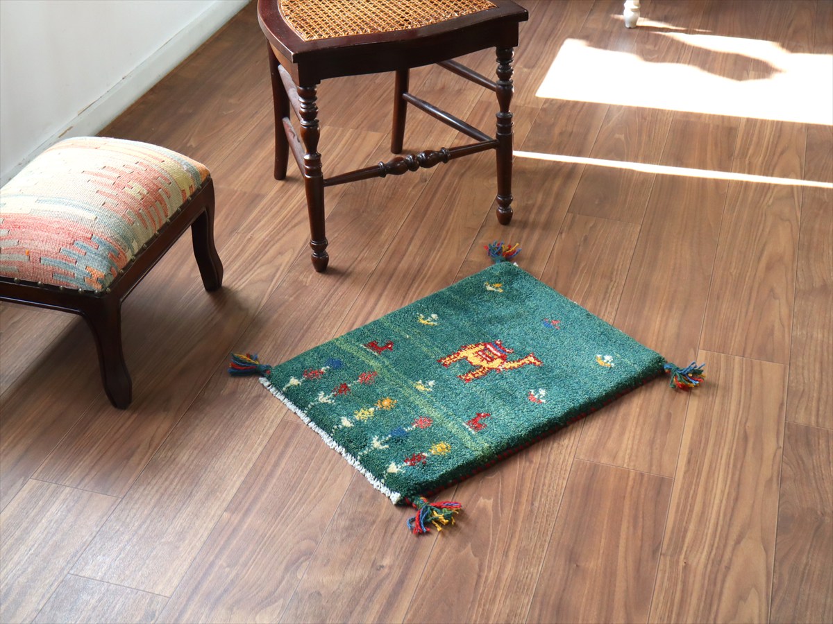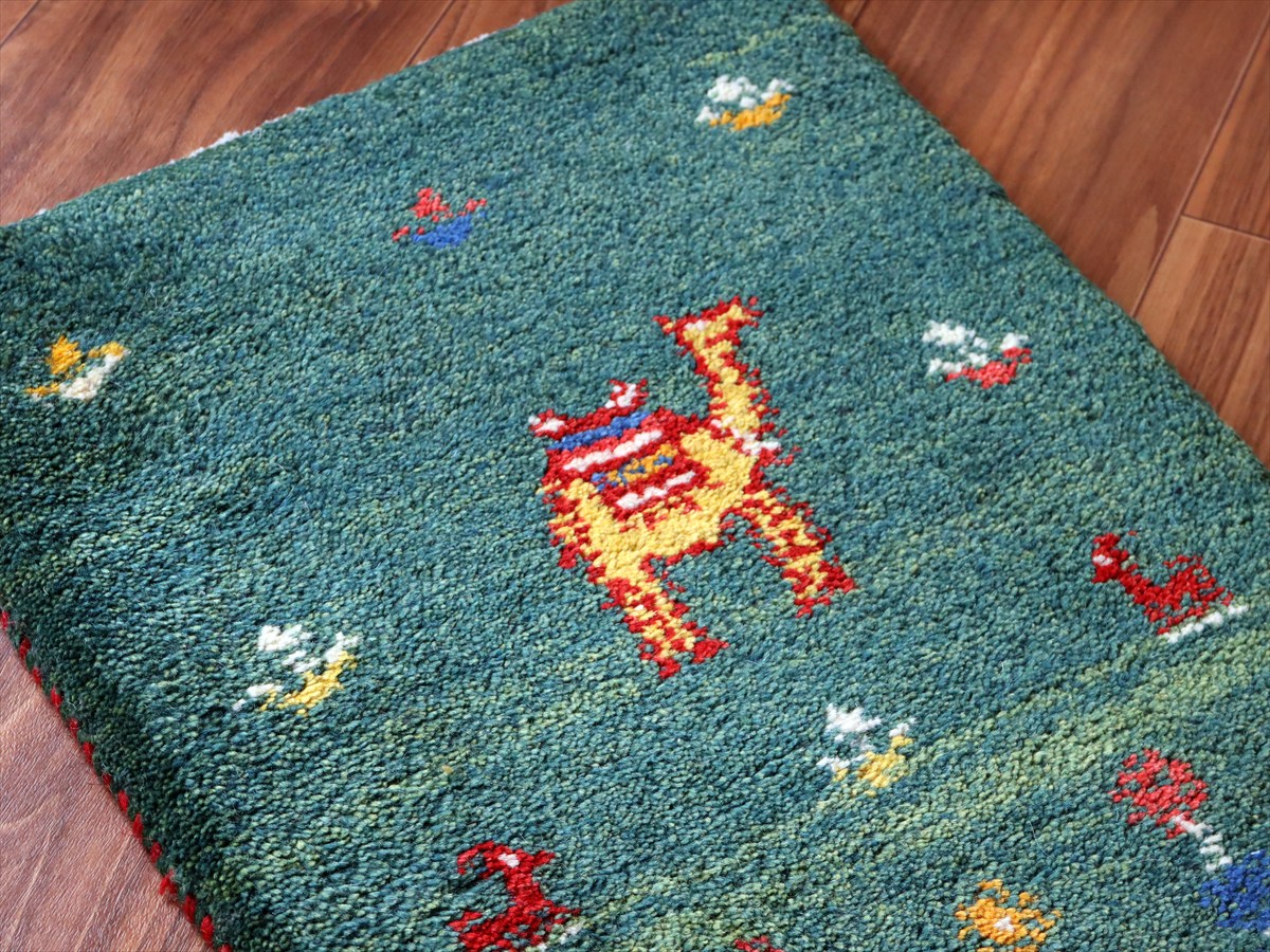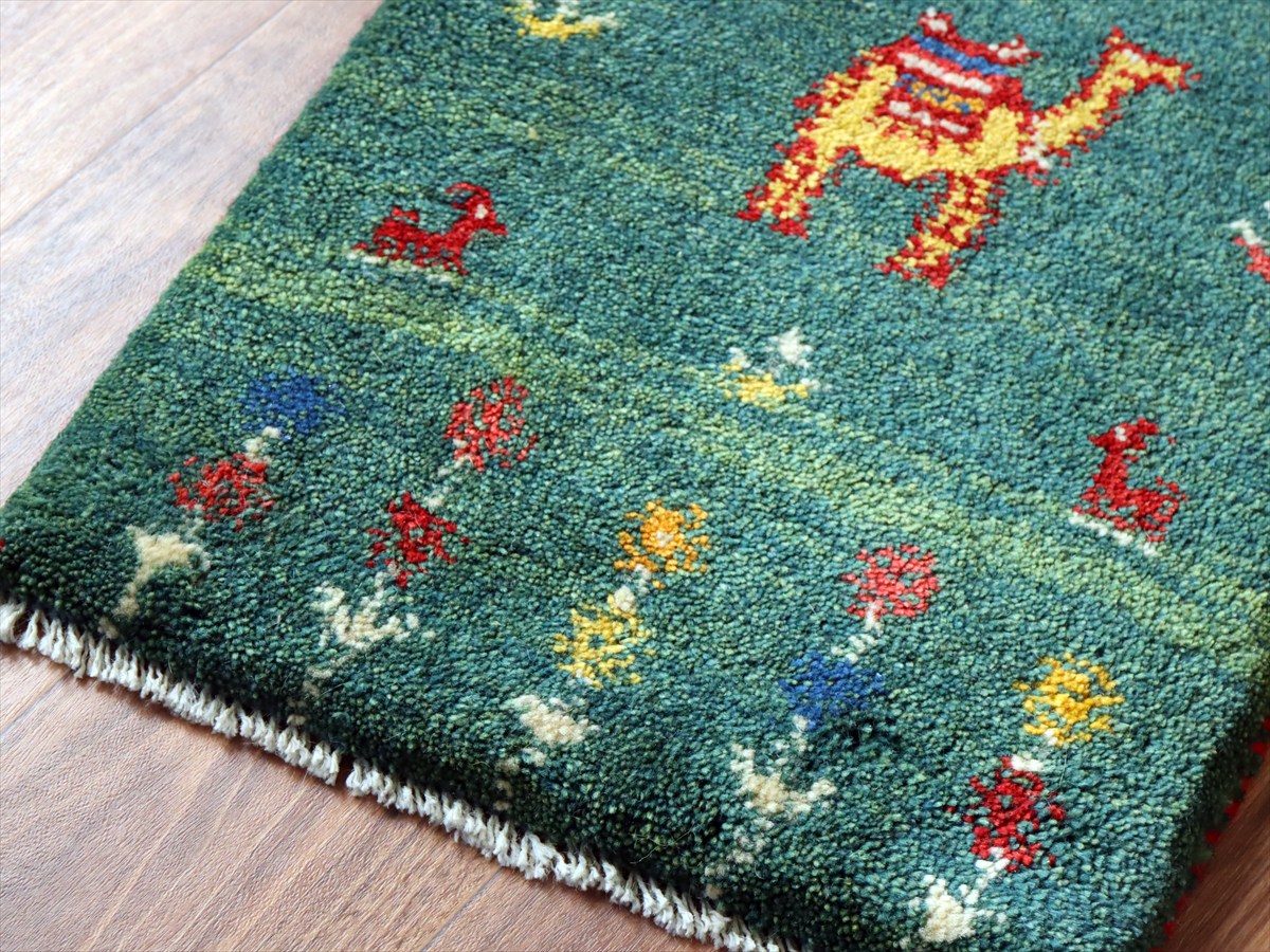 ブルーグリーンのグラデーションをベースに、中央のラクダと小さい生命の樹が織られています。動物モチーフとフラワーモチーフも織られています。