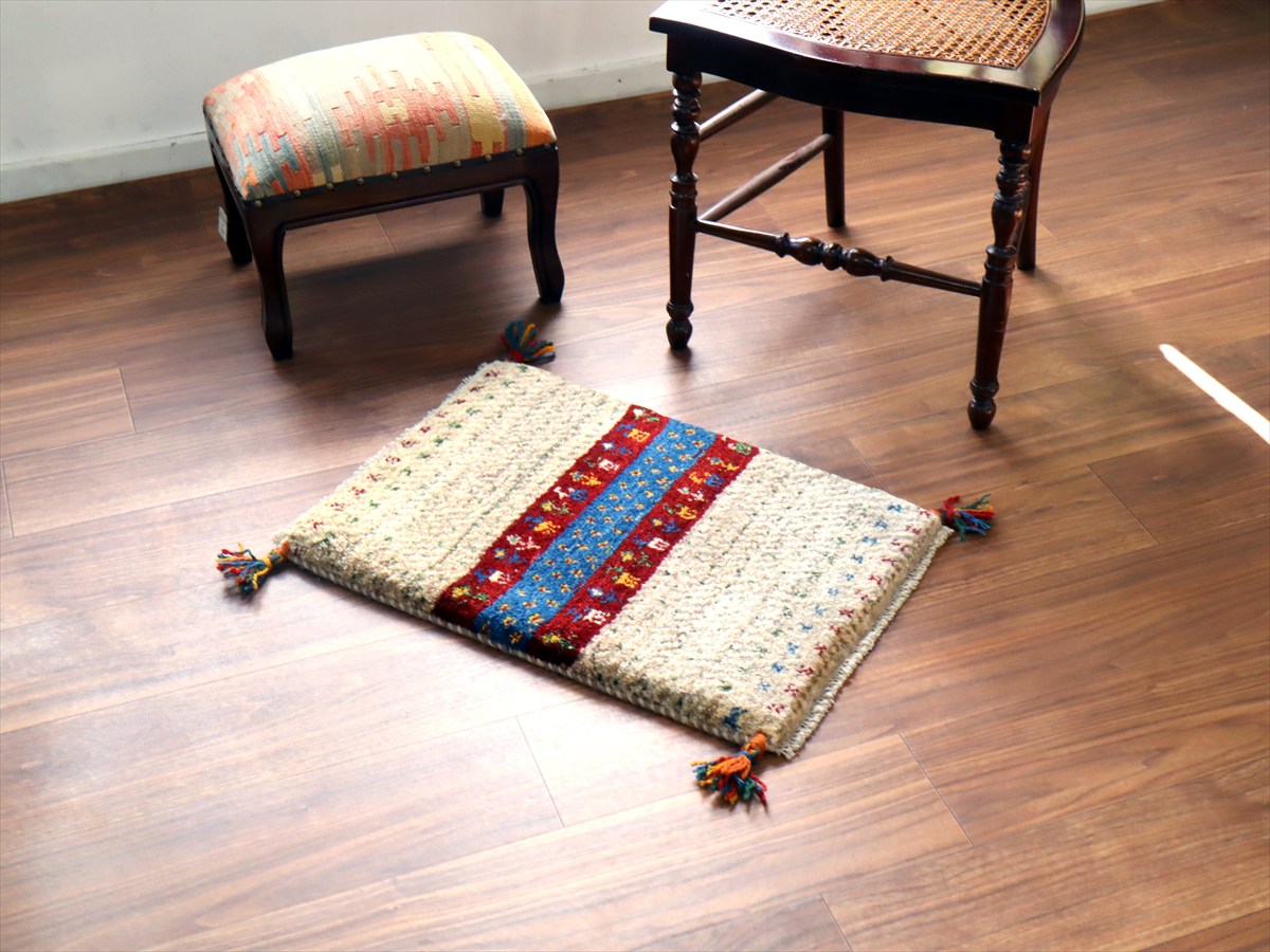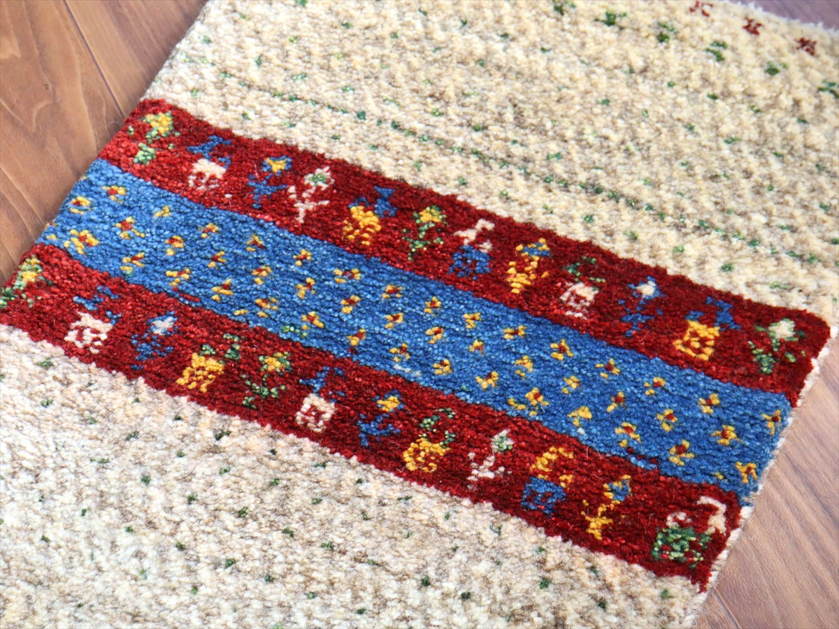 天然の羊毛の色をそのまま使ったアイボリーにカラフルなドットモチーフ。中央のレッドとブルーには、カラフルな動物と生命の樹が織られています。