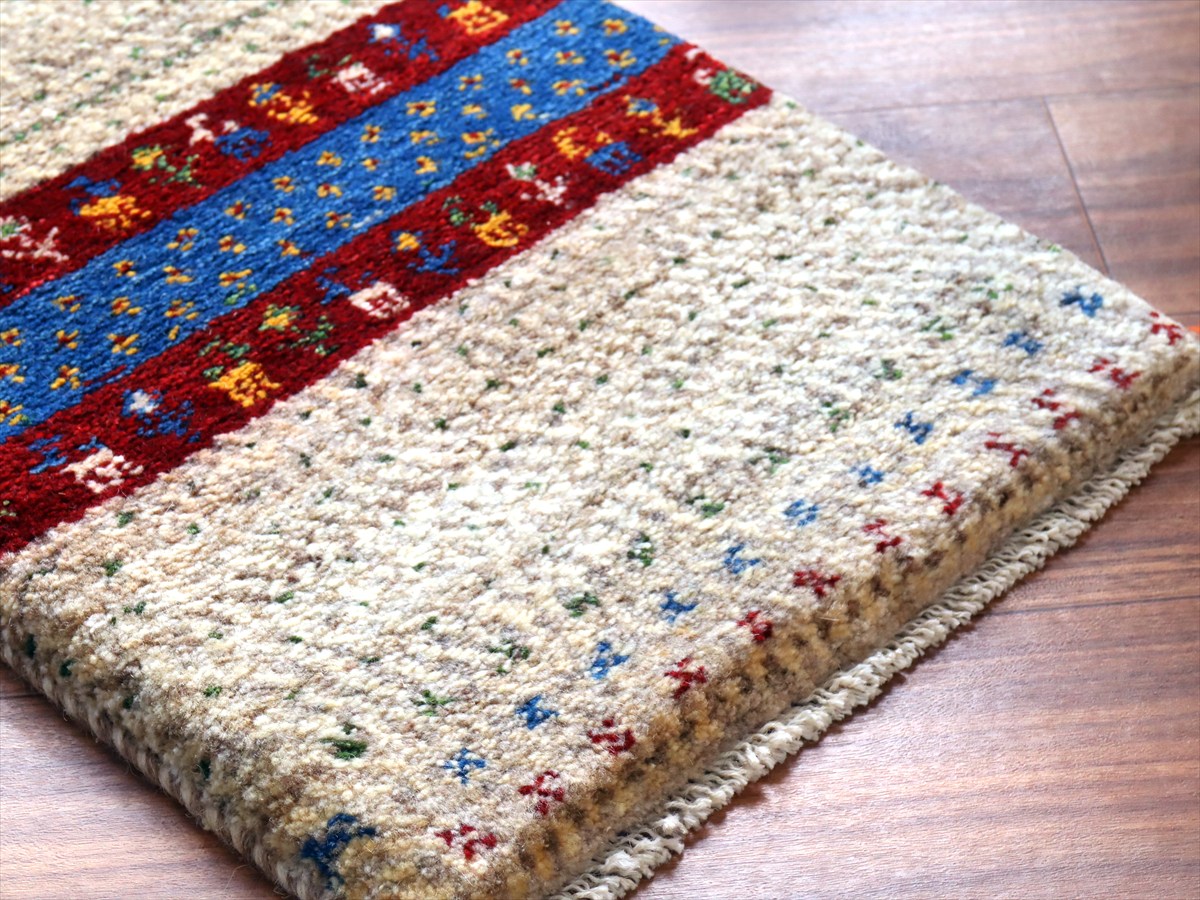 毛足が長くボリュームあるふっくらとした織り地のギャッベ。パイル(毛足)を含めた厚みは2.3-2.4cmほどで、分厚いという表現がぴったりの手織り絨毯です。
