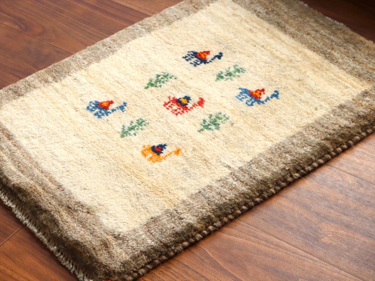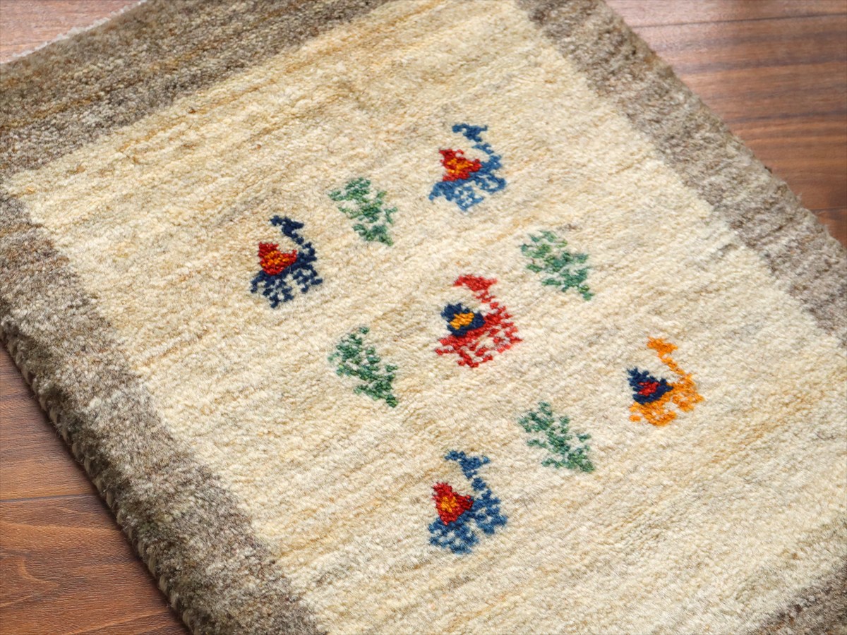 天然の羊毛の色をそのまま使ったアイボリーのギャッベ。ところどころグレーやベージュの毛糸も混ざっています。中央にカラフルなラクダと生命の樹が織られています。
