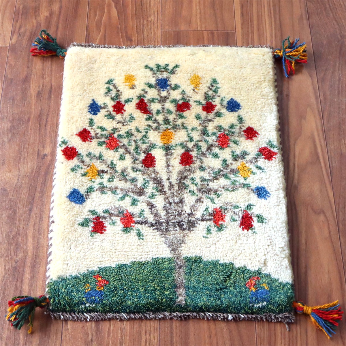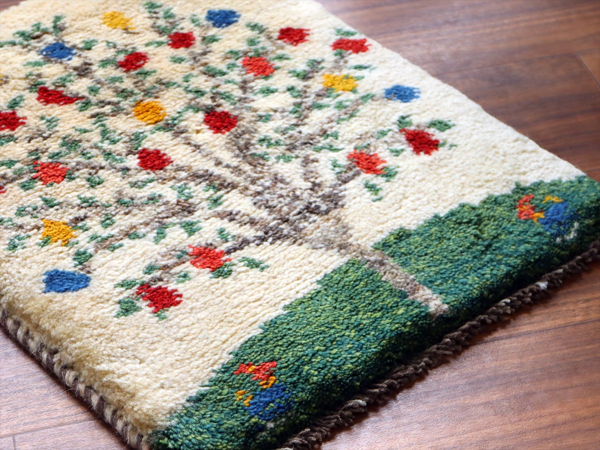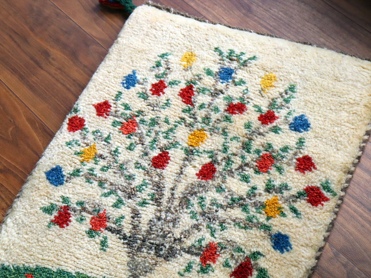 天然の羊毛の色をそのまま使ったアイボリーのギャッベ。ところどころグレーやベージュの毛糸も混ざっています。中央にはカラフルなザクロの生命の樹。丘には動物が織られています。
