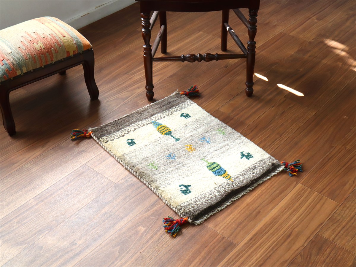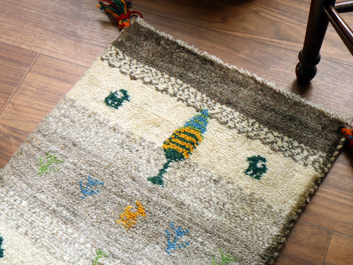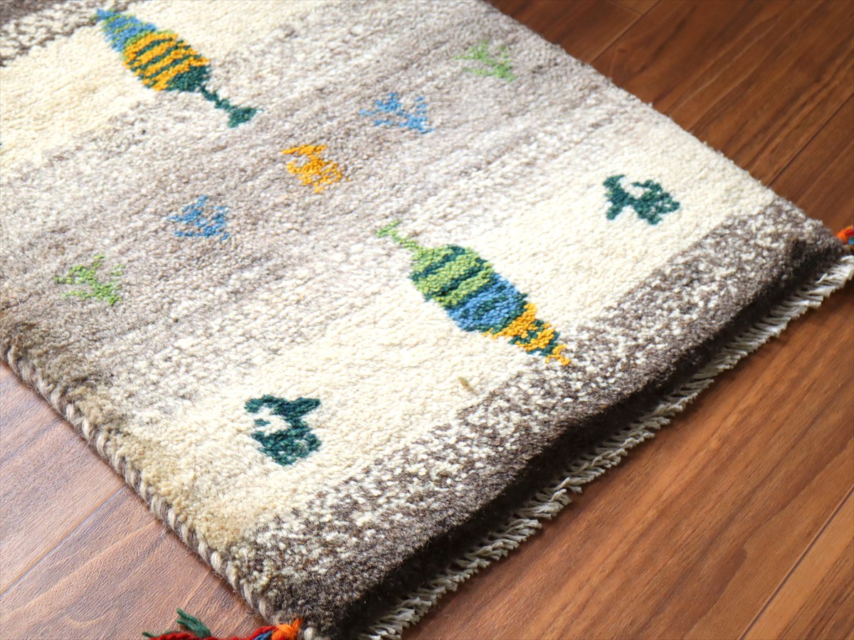 天然の羊毛の色をそのまま使ったアイボリーのギャッベ。ところどころグレーやベージュの毛糸も混ざっています。カラフルな糸杉が鏡写しのように織られています。糸杉は長寿を願う意味を持っていて、ギャベでは多用されるモチーフのひとつです。小さい生命の樹と動物モチーフも織られています。