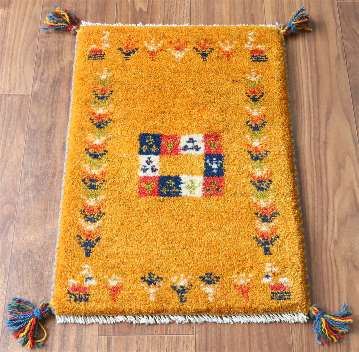 ザクロの実の皮などで染めた発色の良い明るいオレンジイエローをベースに、額に連なる生命の樹と動物モチーフが織られています。中央のカラフルタイルの中にも小さい樹が織られています。