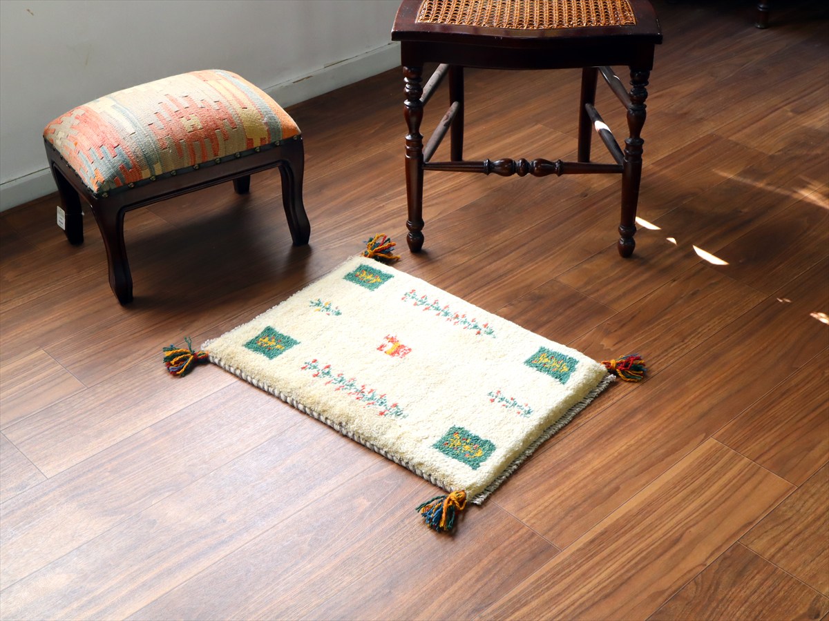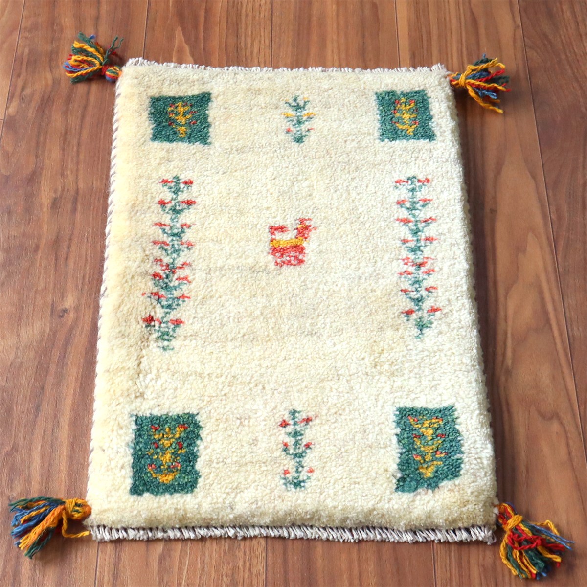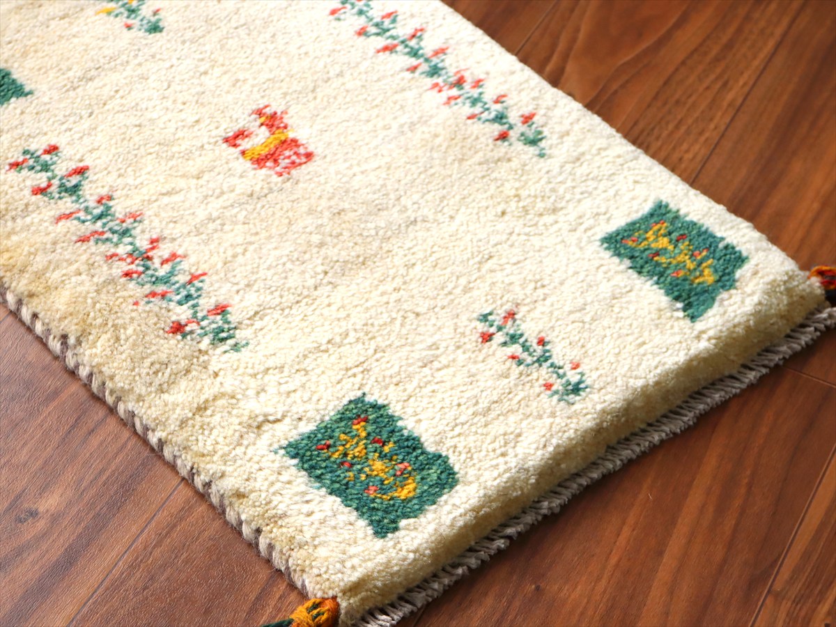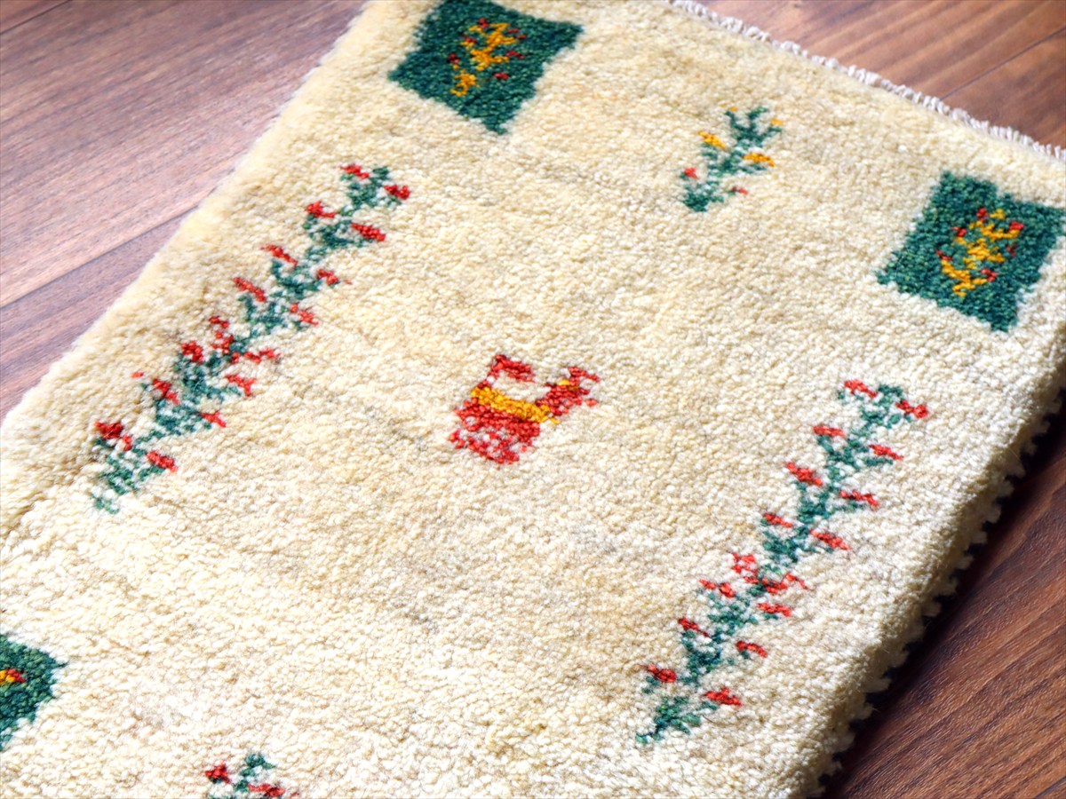 天然の羊毛の色をそのまま使ったアイボリーのギャッベ。ところどころグレーやベージュの毛糸も混ざっています。中央には、動物と連なる生命の樹。四隅にはグリーンのタイルに中に生命の樹が織られています。