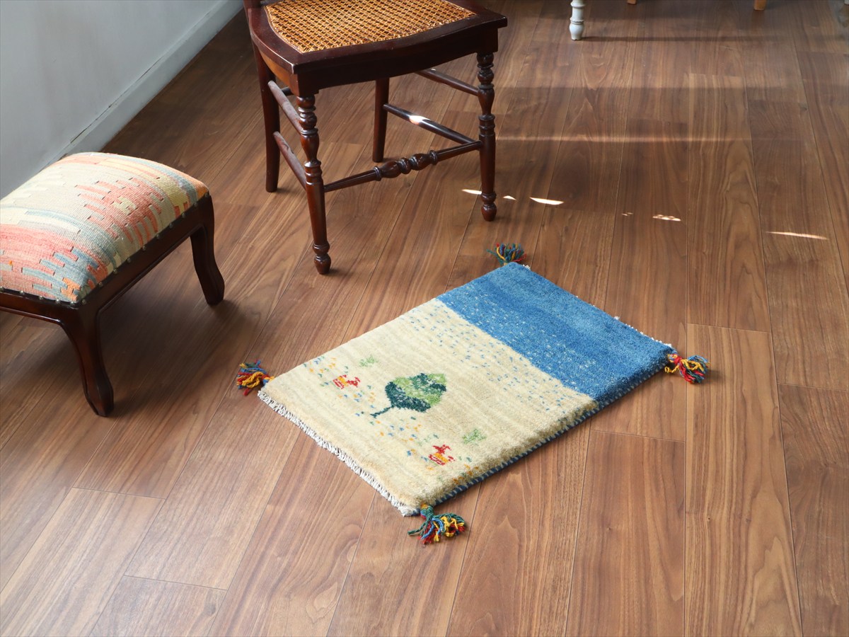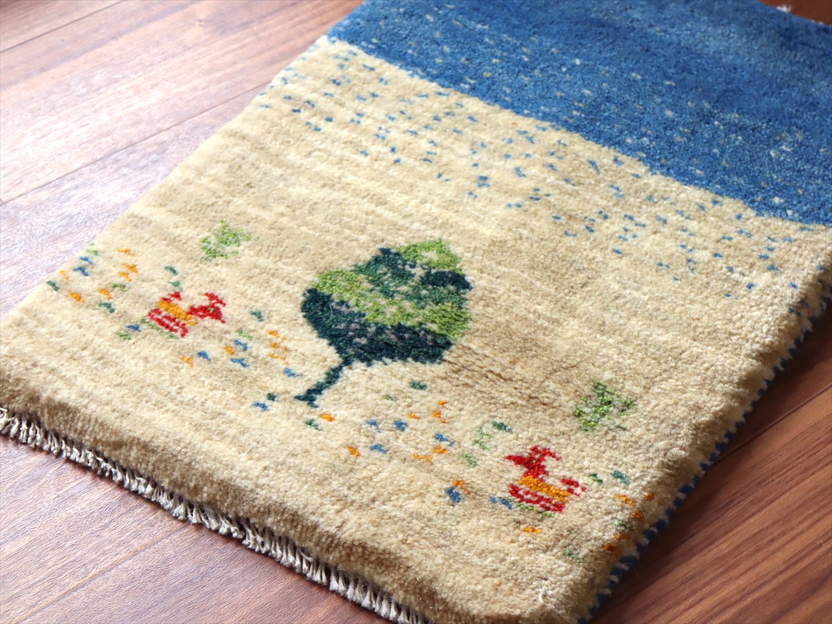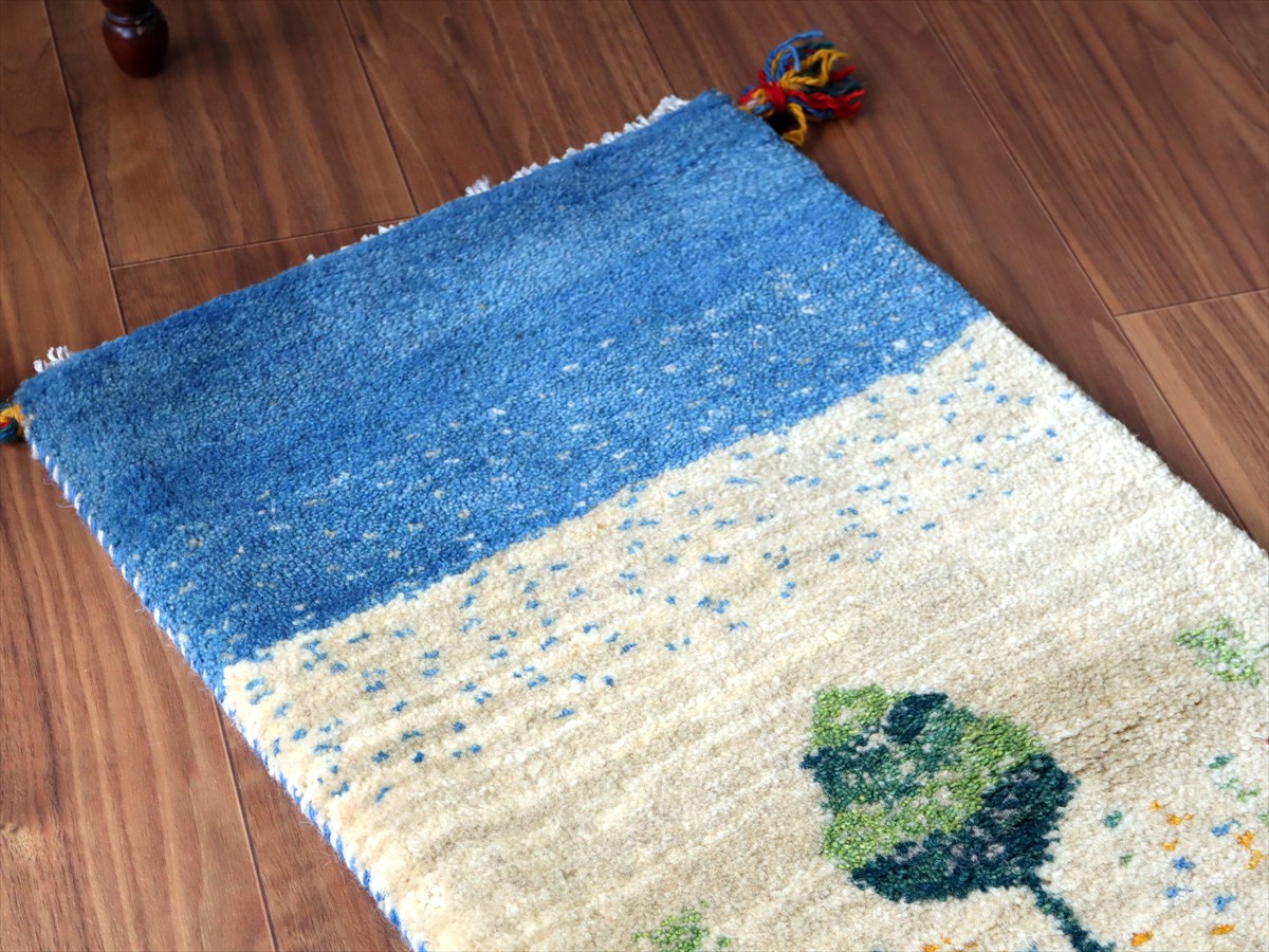天然の羊毛の色をそのまま使ったアイボリーのギャッベ。ところどころグレーやベージュの毛糸も混ざっています。ブルーの空の下に糸杉と動物が織られています。は長寿を願う意味を持っていて、ギャベでは多用されるモチーフのひとつです。