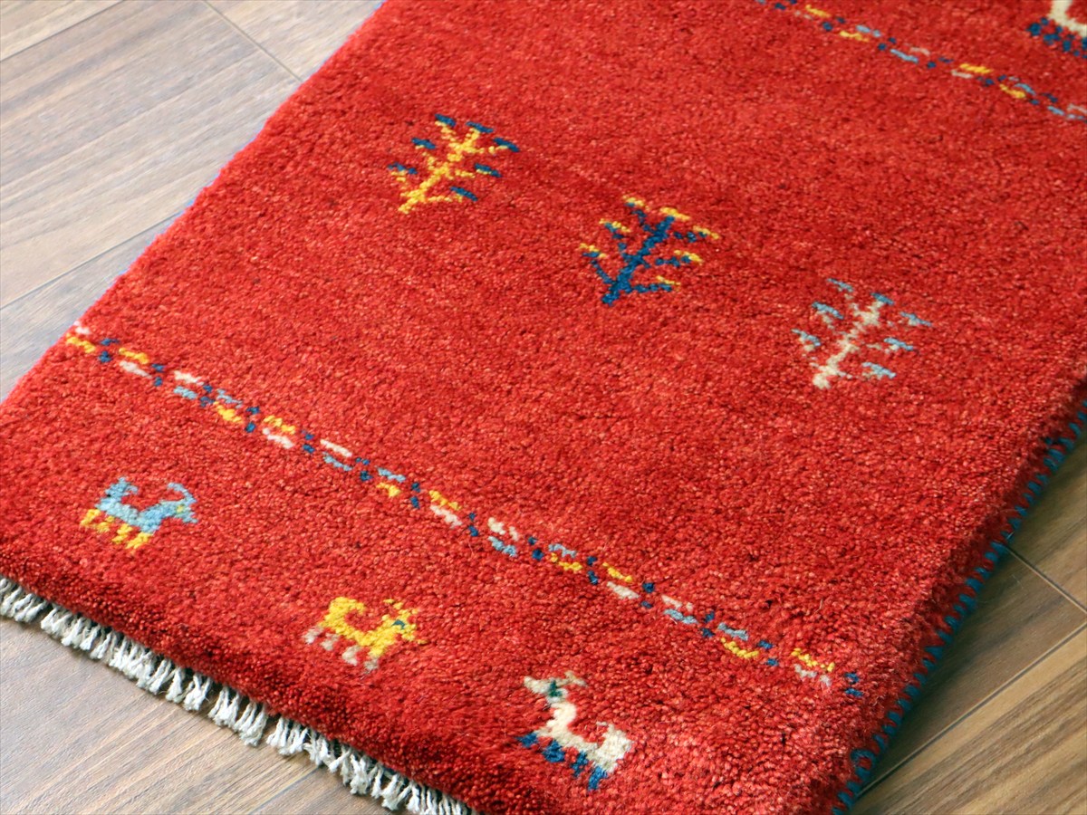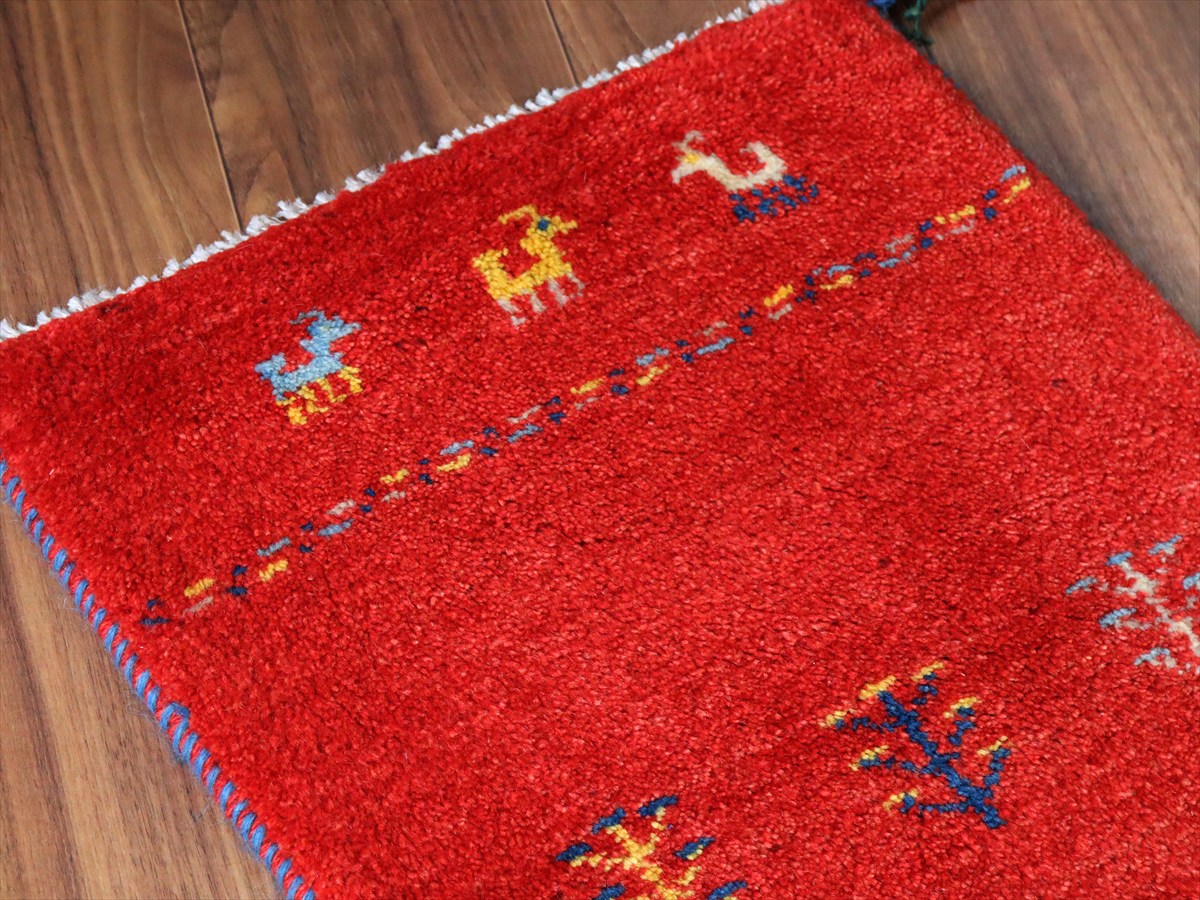 西洋アカネの根染める、草木染の明るいレッド。中央には生命の樹。上下には動物モチーフが織られています。