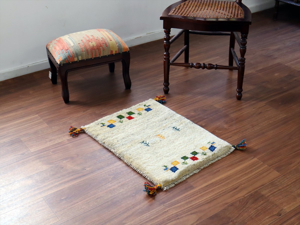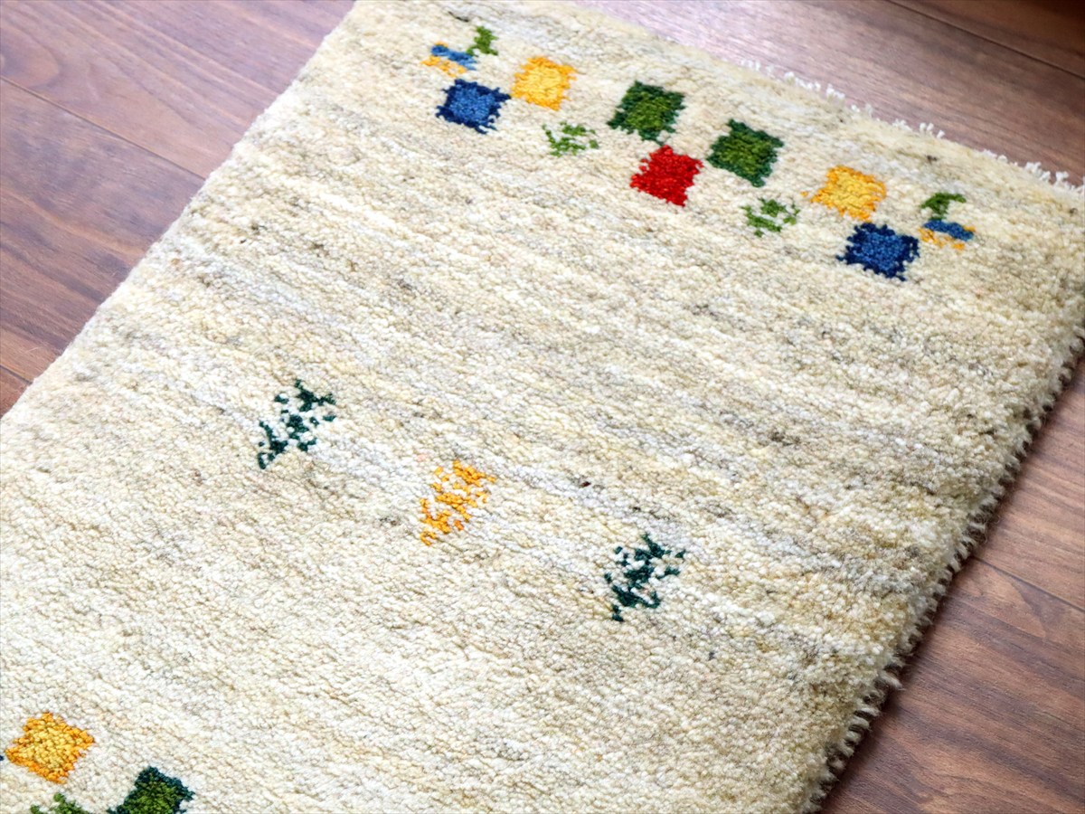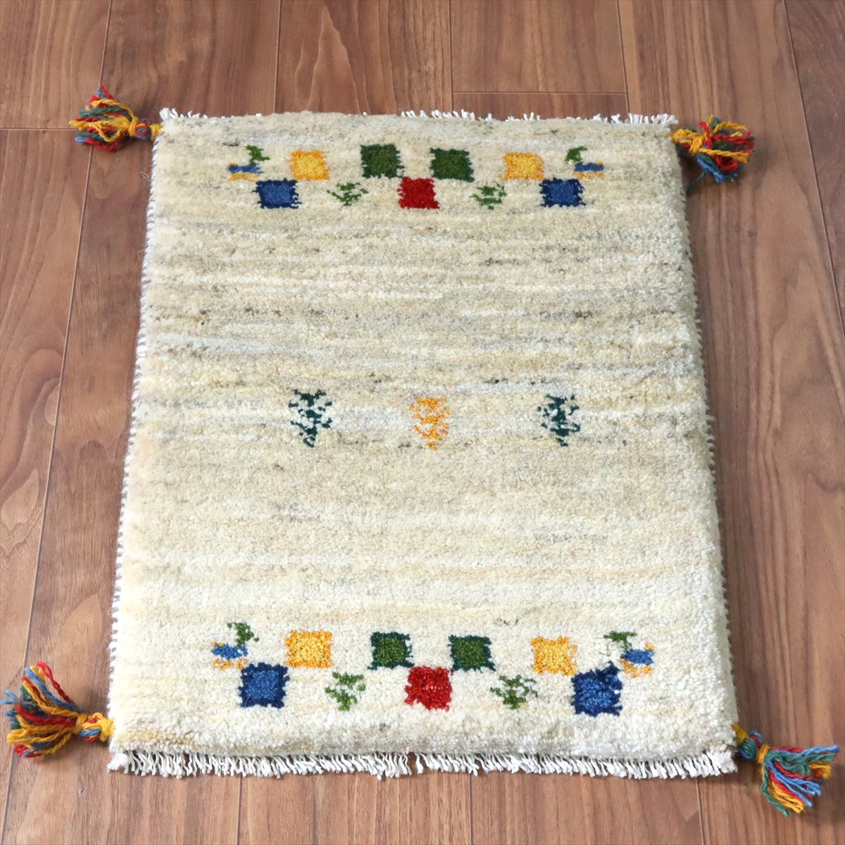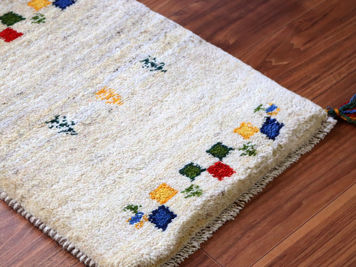 天然の羊毛の色をそのまま使ったアイボリーのギャッベ。ところどころグレーやベージュの毛糸も混ざっています。中央には生命の樹と上下にはカラフルタイルと動物が織られています。