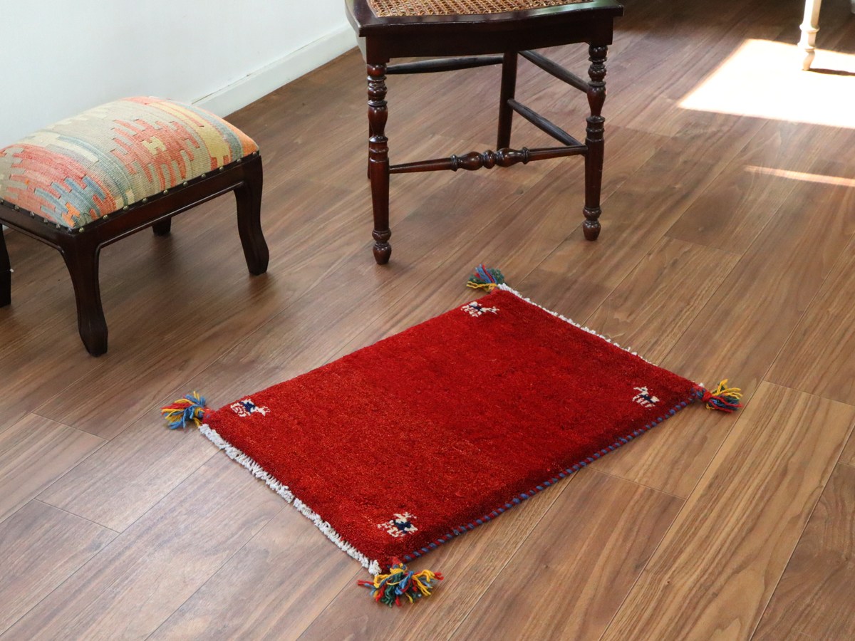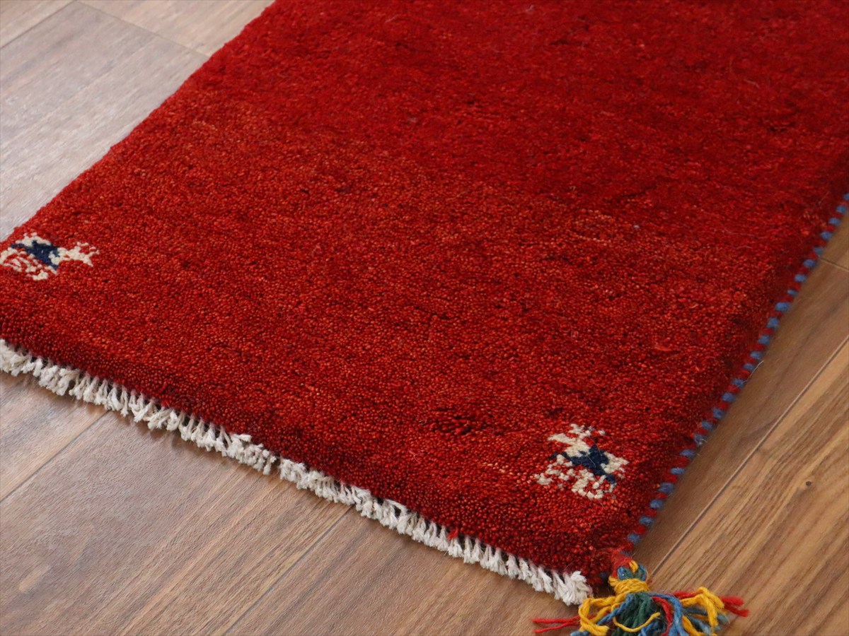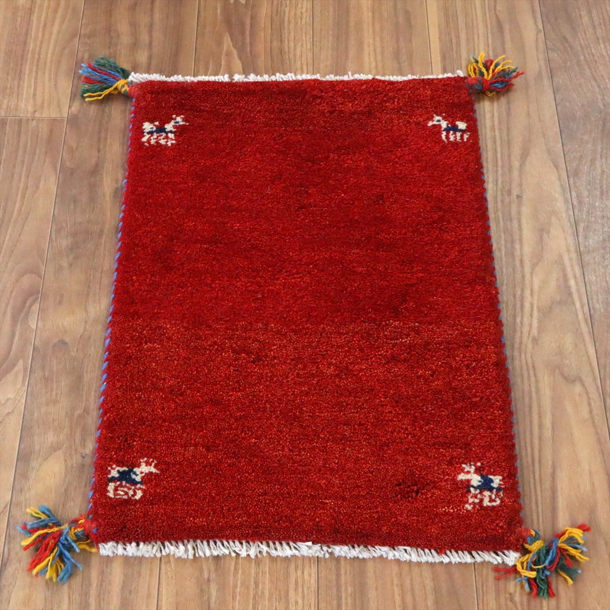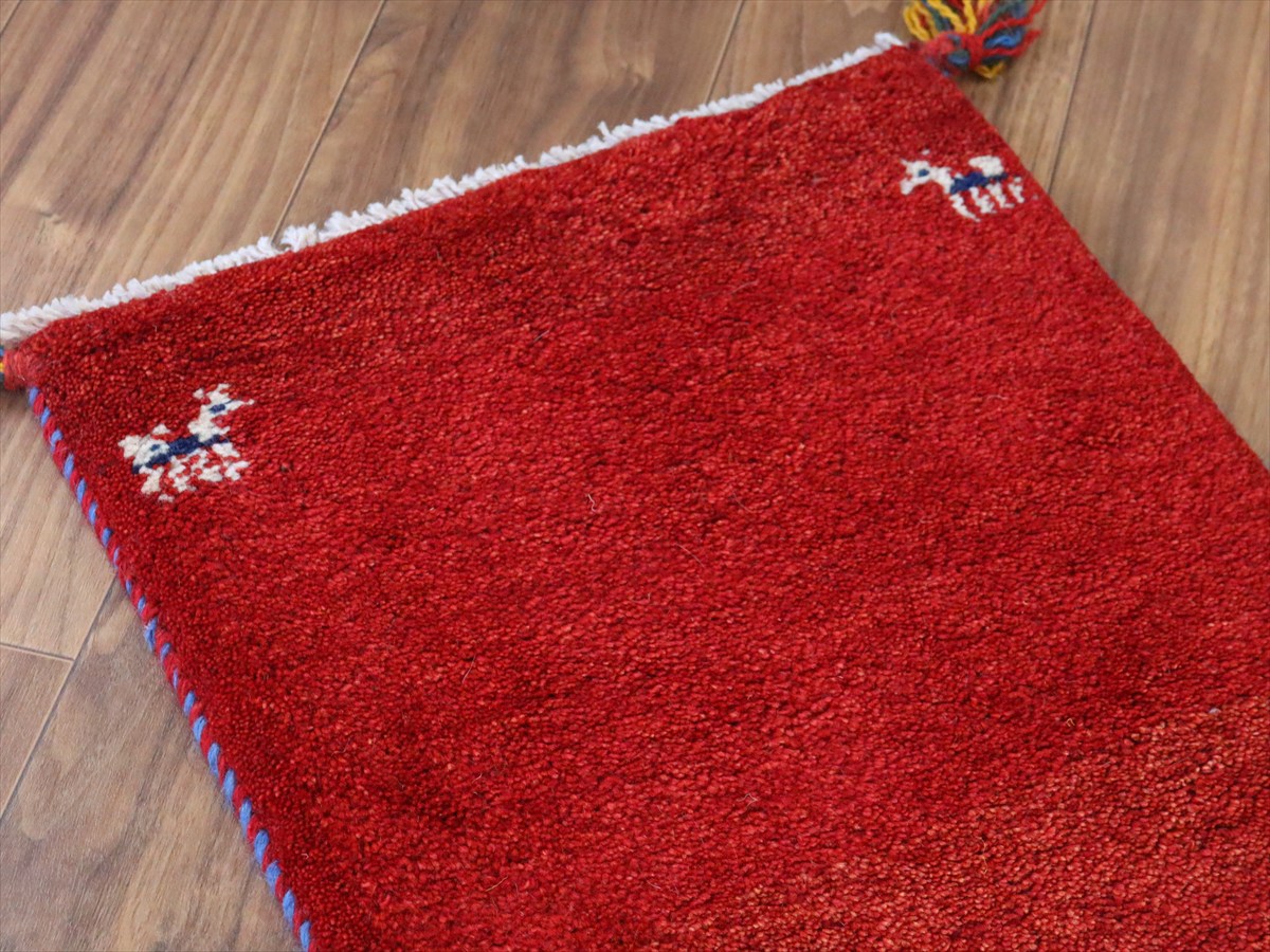 西洋アカネの根染める、草木染の明るいレッド。四隅に動物が織られているシンプルなギャッベ。