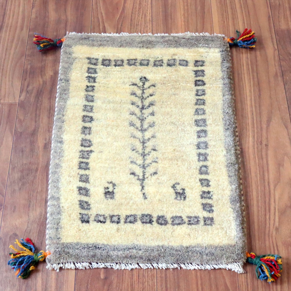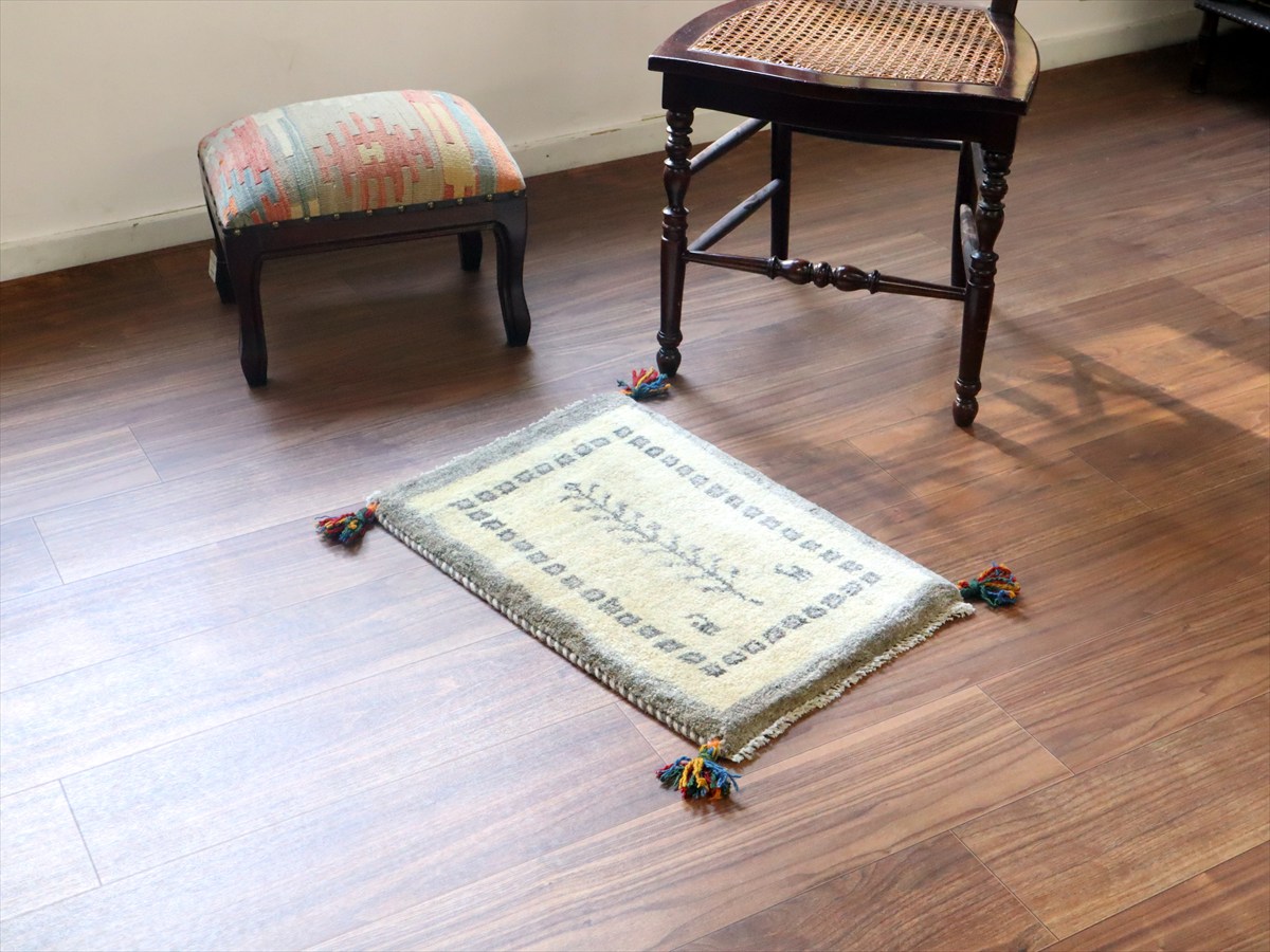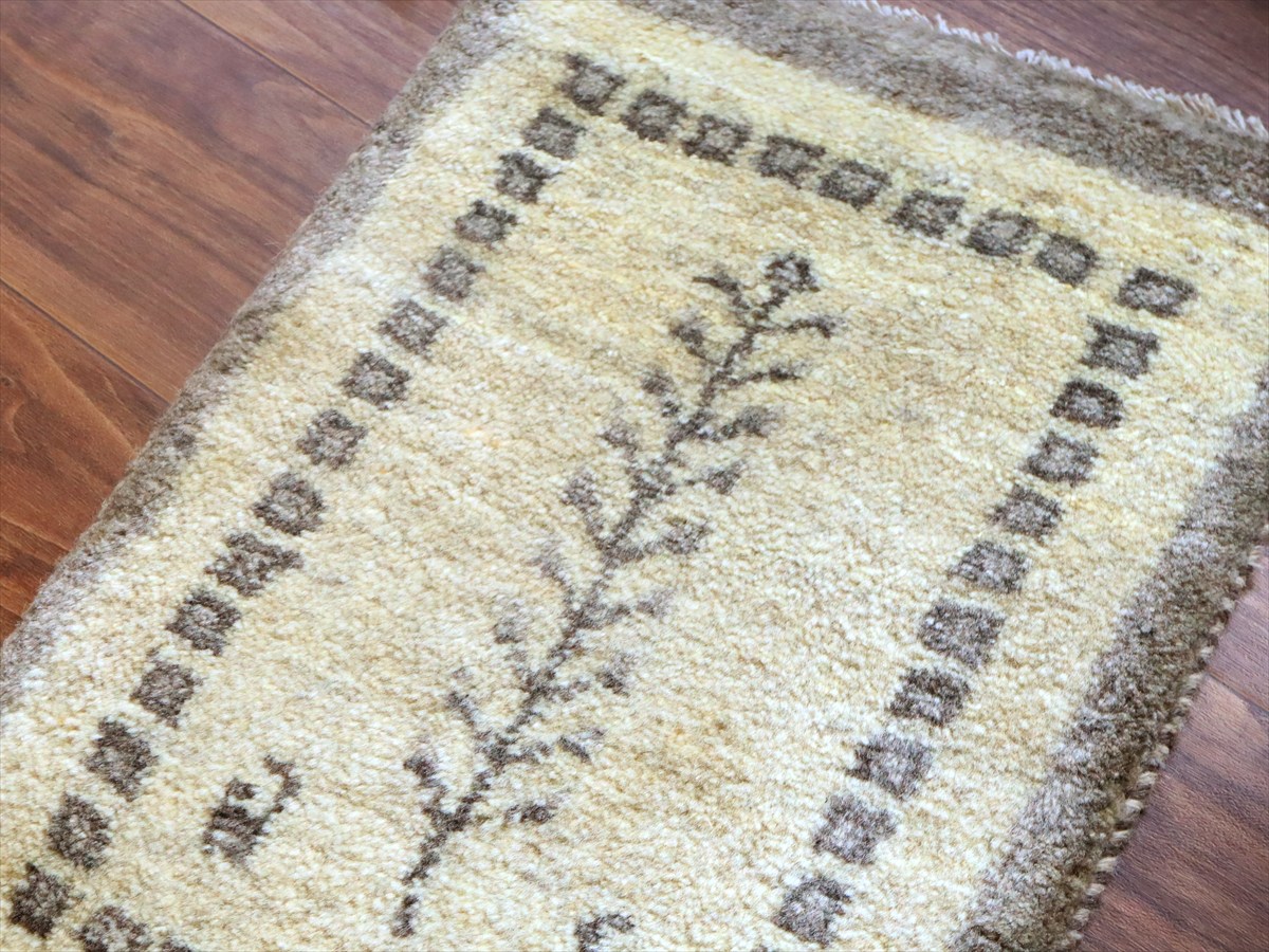 天然の羊毛の色をそのまま使ったアイボリーのギャッベ。ところどころグレーやベージュの毛糸も混ざっています。グレーで生命の樹や動物モチーフが織られていて、落ち着いた雰囲気の一枚に仕上がっています。