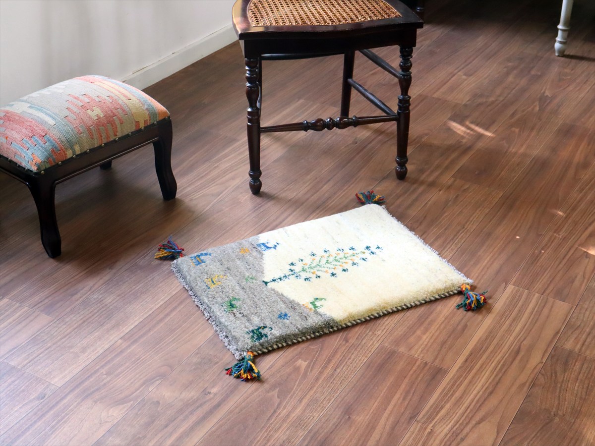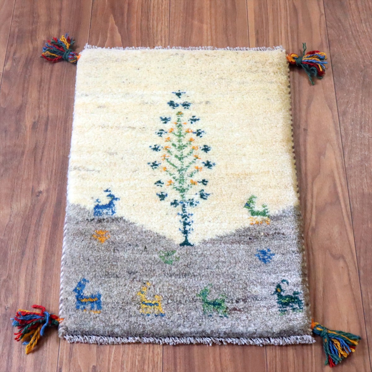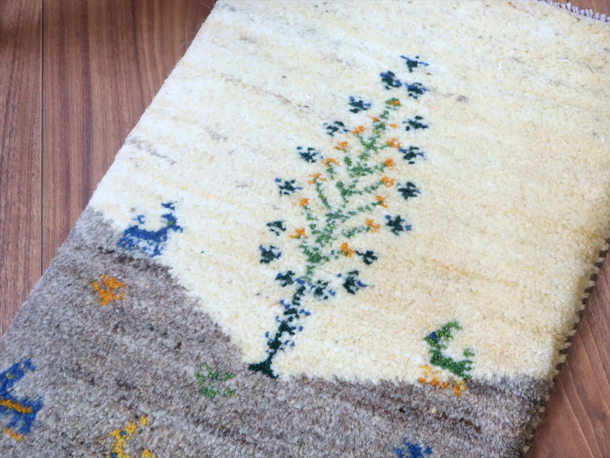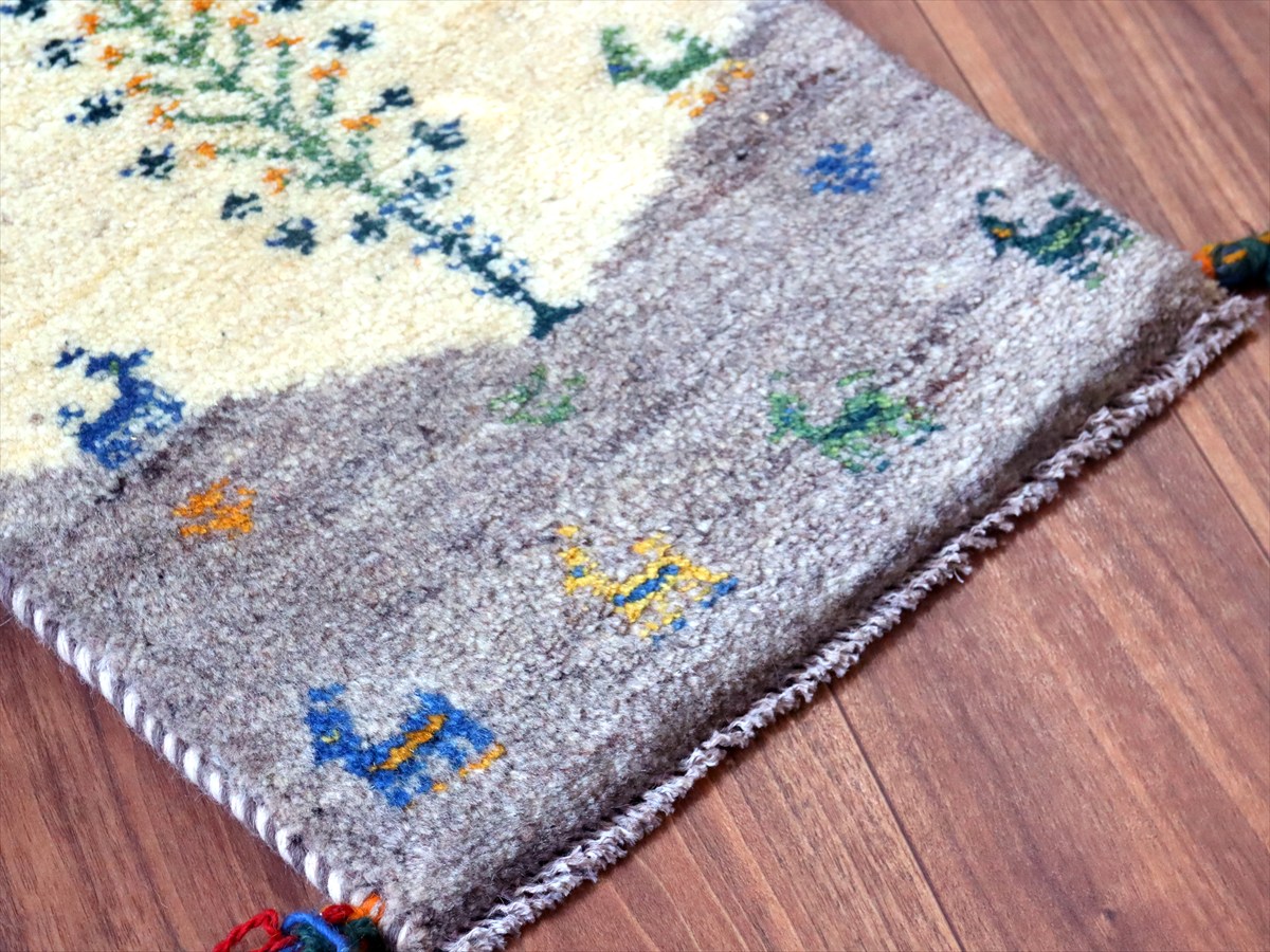 天然の羊毛の色をそのまま使ったアイボリーのギャッベ。ところどころグレーやベージュの毛糸も混ざっています。丘の上に生命の樹と動物が織られています。