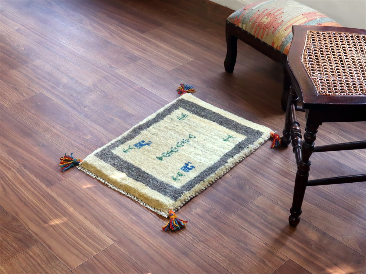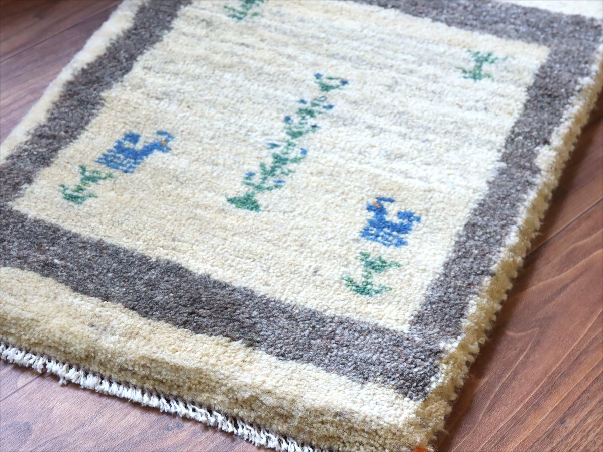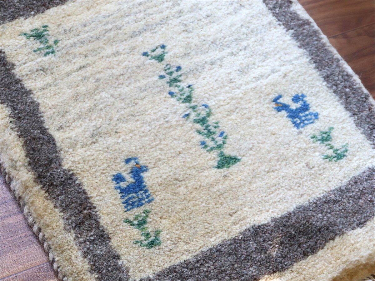 天然の羊毛の色をそのまま使ったアイボリーのギャッベ。ところどころグレーやベージュの毛糸も混ざっています。生命の樹と動物モチーフが織られています。
