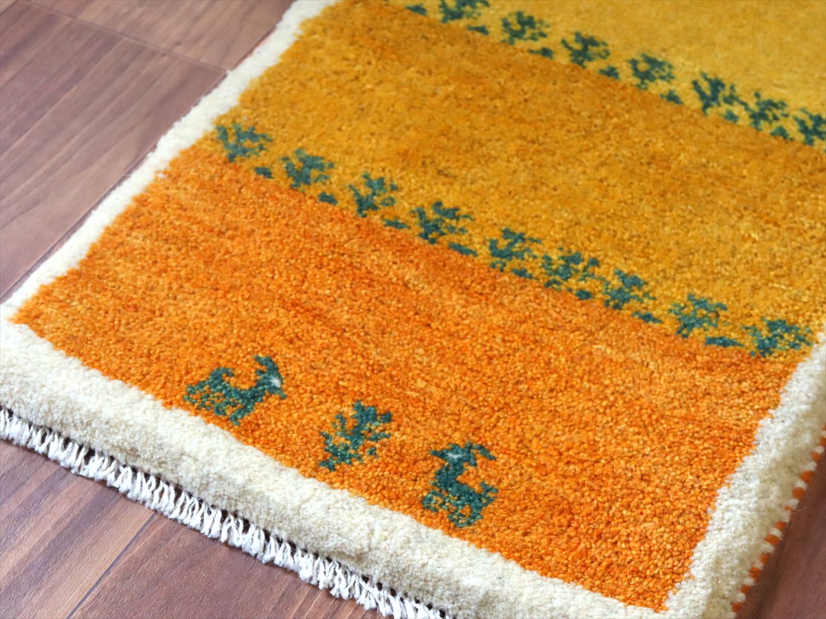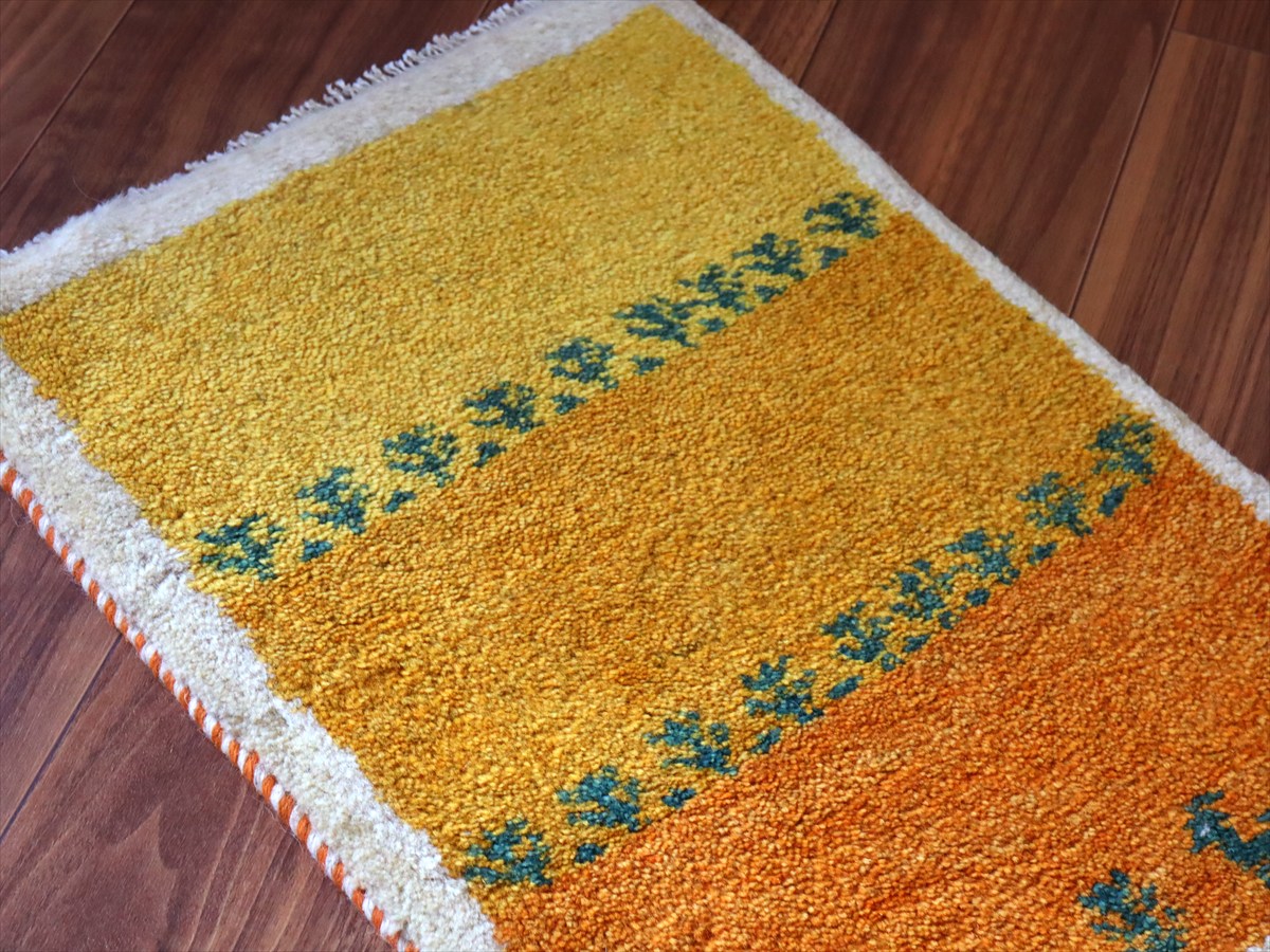 ザクロの実の皮などで染めた発色の良い明るいオレンジイエローをベースに、小さい生命の樹と動物モチーフが織られています。