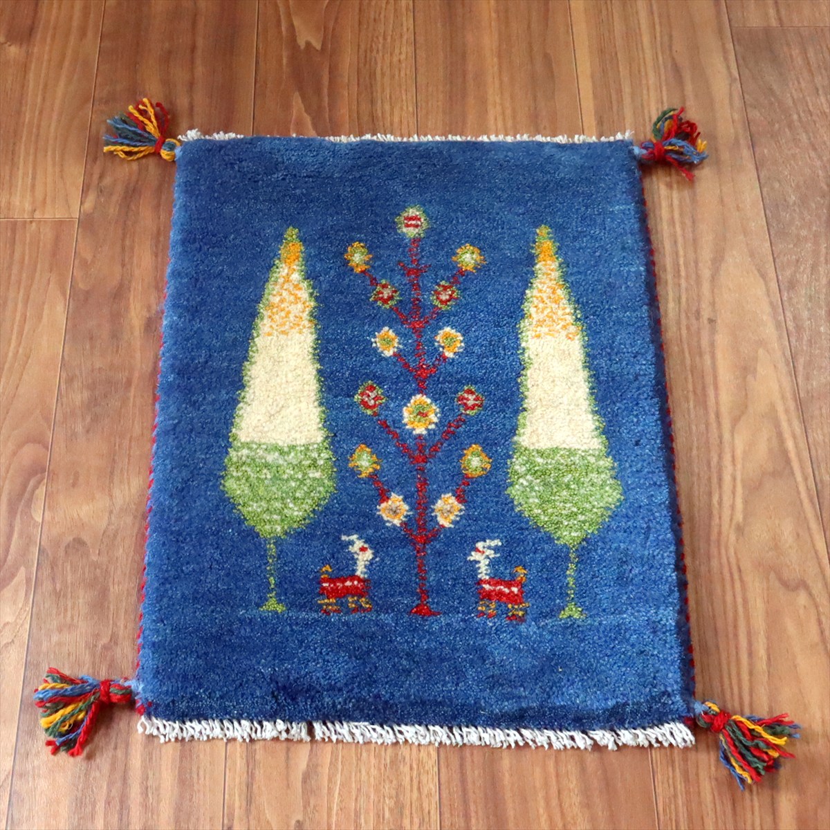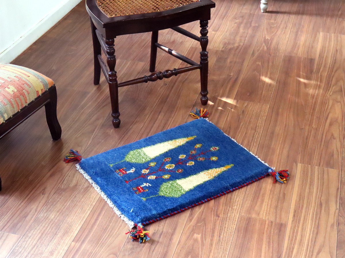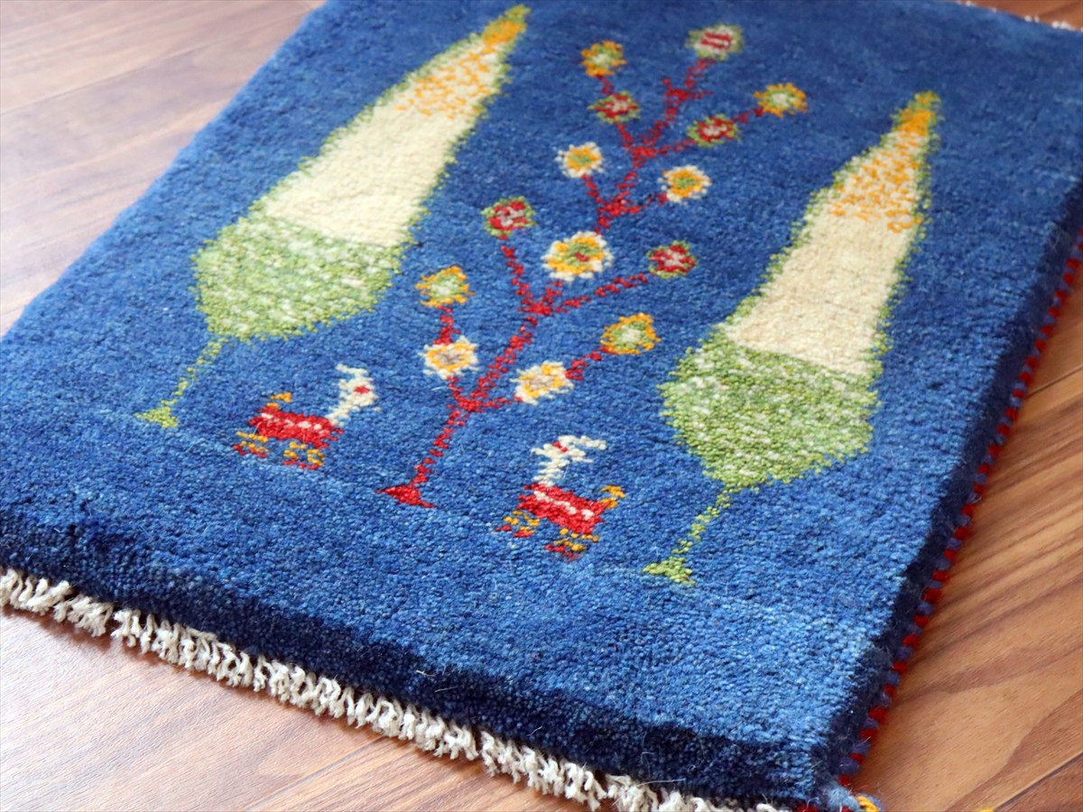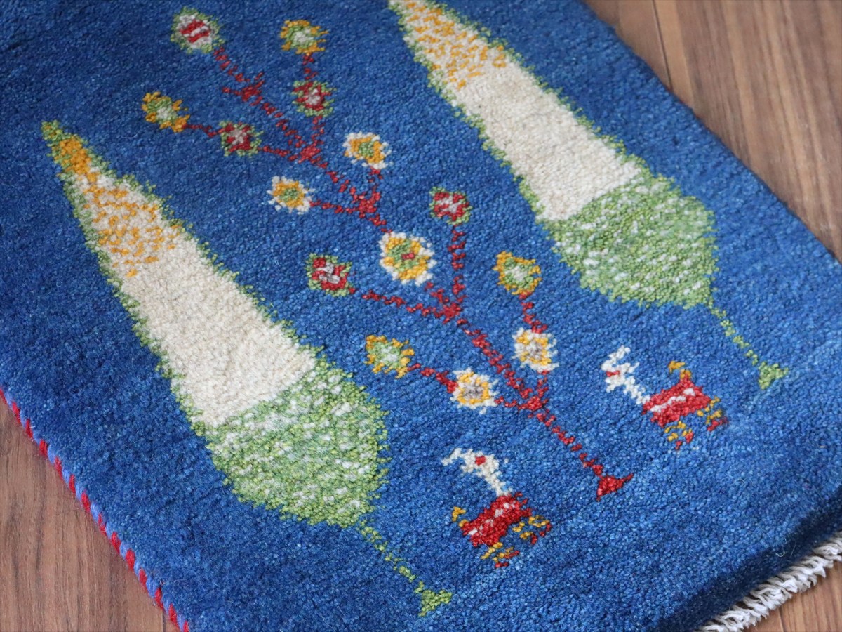 明るいブルーのベースは色ムラによる自然なグラデーションができています。日本の糸杉の間に生命の樹と動物モチーフが織られています。糸杉は長寿を願う意味を持っていて、ギャベでは多用されるモチーフのひとつです。中央には動物モチーフも織られています。