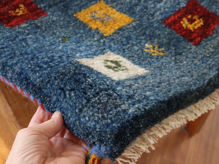 毛足の長いギャッベの中でも、かなりボリューム感のある分厚い織りです。パイル(毛足)と下地を合わせた厚みは2.4-2.5cmほど。