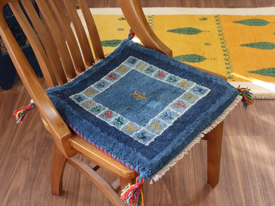 トーンの違うブルーでボーダーが織られ、タイルモチーフの中にはカラフルな草花モチーフがデザインされています。
