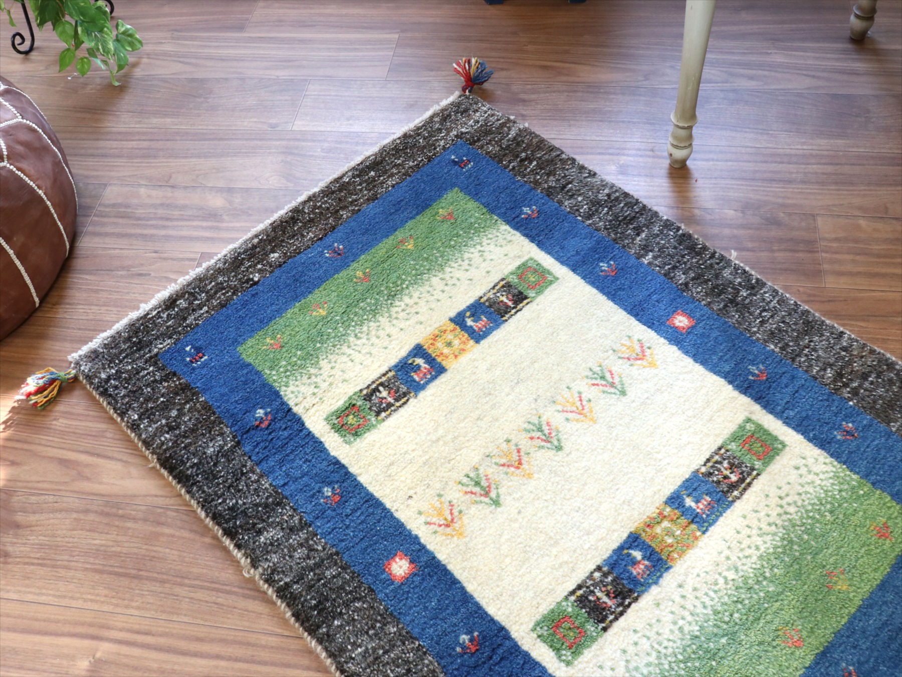 ギャッべ 玄関マット イラン製手織りラグ 121×84cm ベージュ&グリーン/ブルー&ダークブラウン タイル