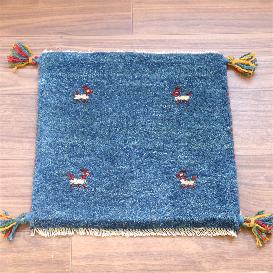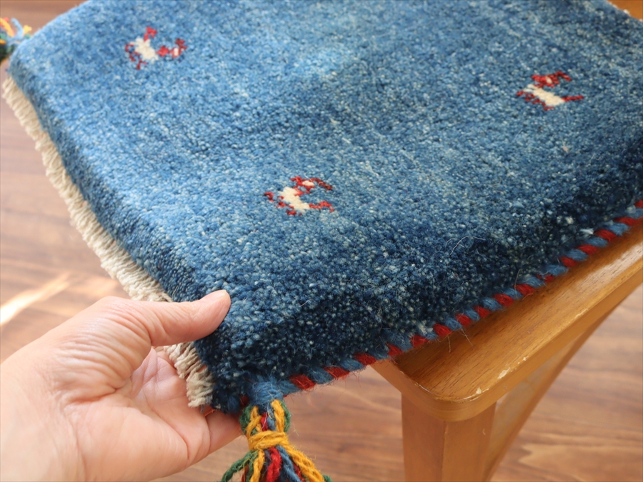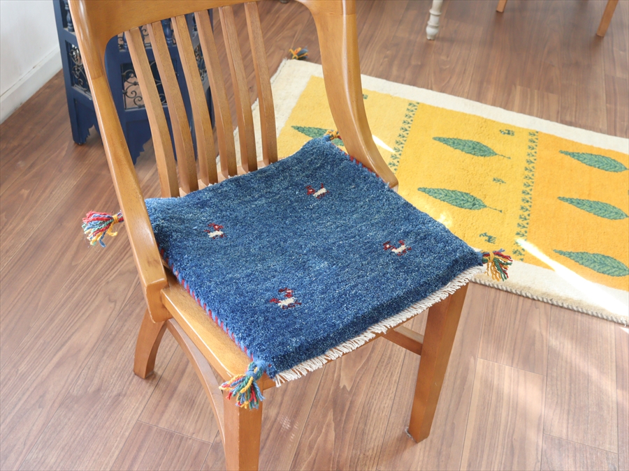 何枚も集めたくなる、40cm角の座布団サイズギャベ。四隅に大きなポンポンのついた、伝統的なスタイルでおられています。フローリングに並べて座布団がわりに使ったり、ベンチやダイニングチェアの座面など、使い方はいろいろ。壁にタペストリーのように飾るのもおすすめです。
