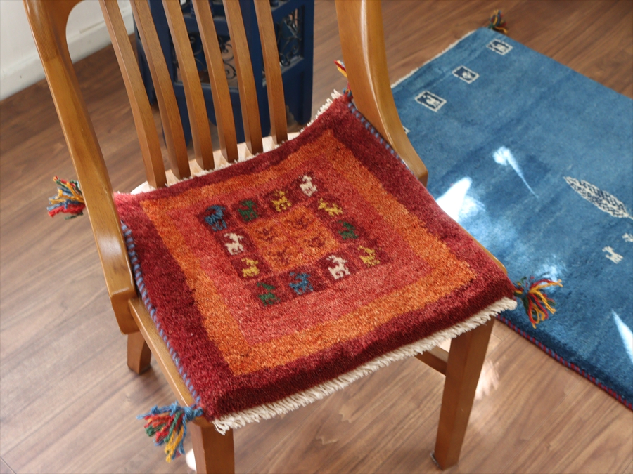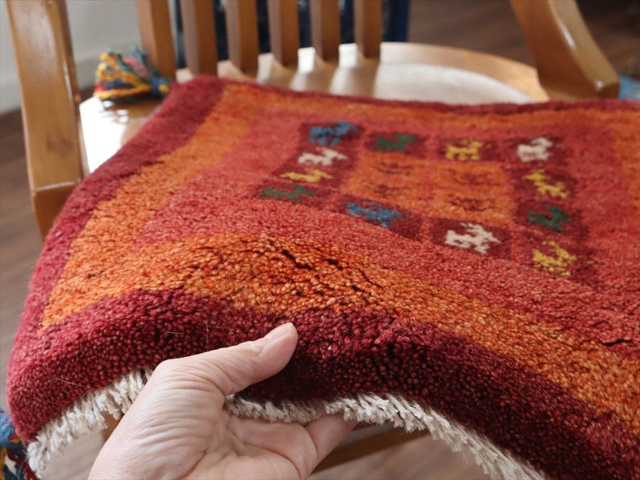 何枚も集めたくなる、40cm角の座布団サイズギャベ。四隅に大きなポンポンのついた、伝統的なスタイルでおられています。フローリングに並べて座布団がわりに使ったり、ベンチやダイニングチェアの座面など、使い方はいろいろ。壁にタペストリーのように飾るのもおすすめです。