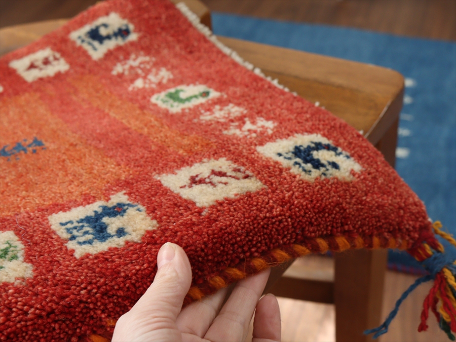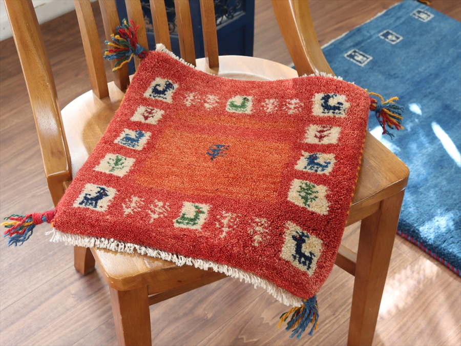 何枚も集めたくなる、40cm角の座布団サイズギャベ。四隅に大きなポンポンのついた、伝統的なスタイルでおられています。フローリングに並べて座布団がわりに使ったり、ベンチやダイニングチェアの座面など、使い方はいろいろ。壁にタペストリーのように飾るのもおすすめです。