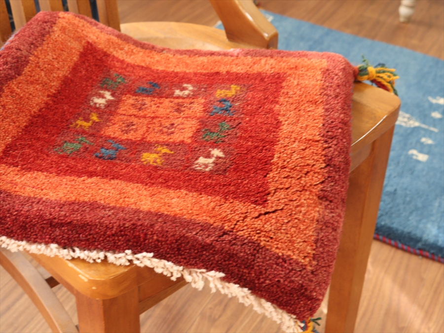 何枚も集めたくなる、40cm角の座布団サイズギャベ。四隅に大きなポンポンのついた、伝統的なスタイルでおられています。フローリングに並べて座布団がわりに使ったり、ベンチやダイニングチェアの座面など、使い方はいろいろ。壁にタペストリーのように飾るのもおすすめです。
