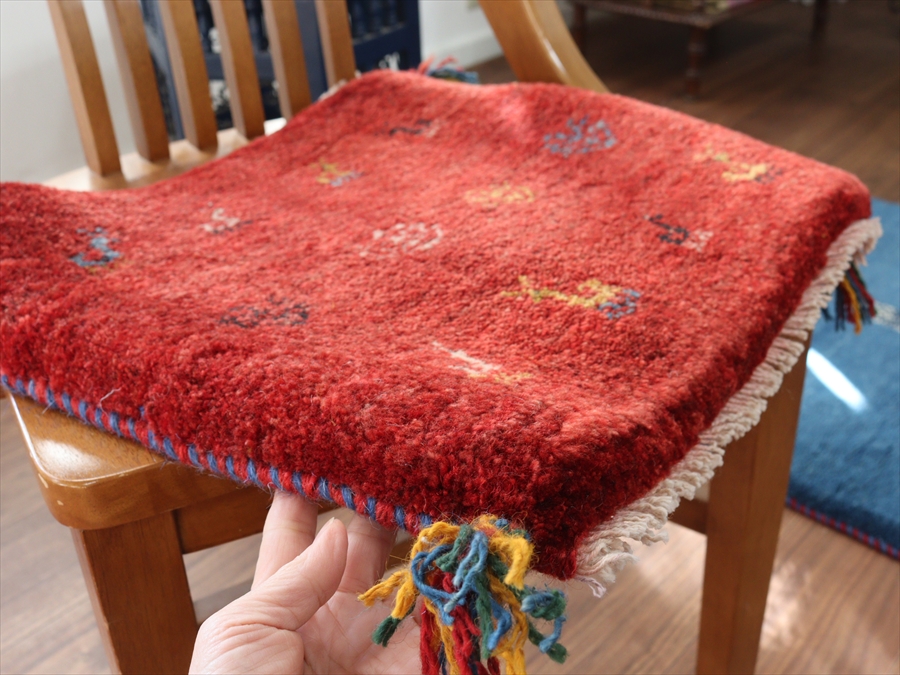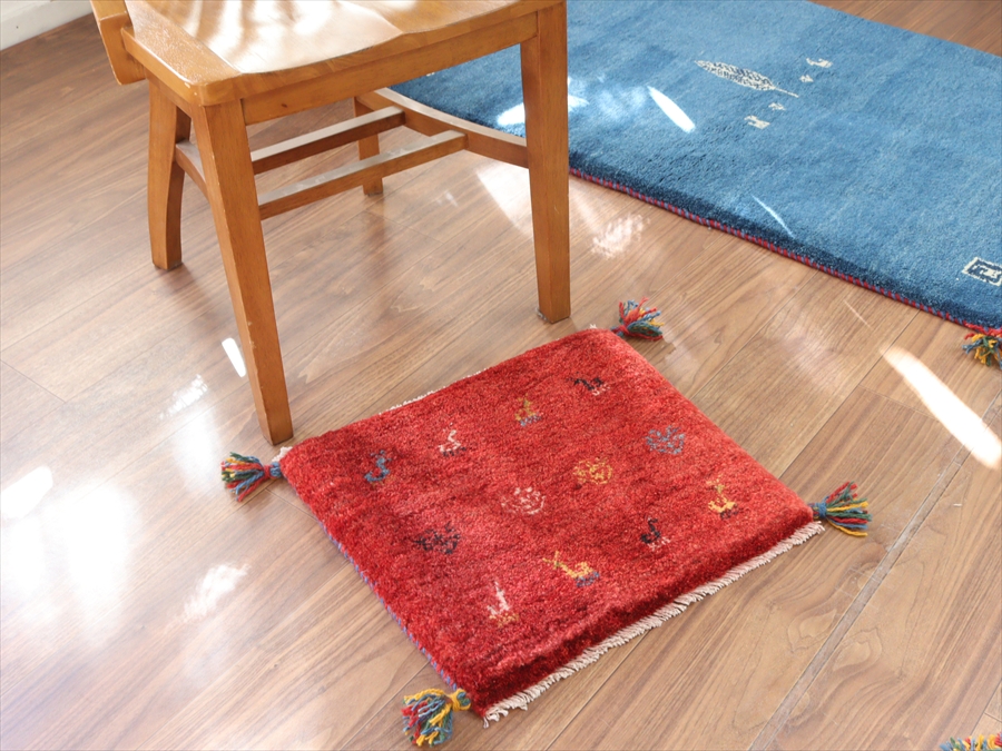 ギャッベ イラン産手織り 座布団サイズ 41x46cm レッド シンプル 動物と草花モチーフ
