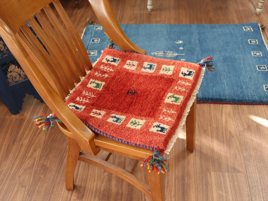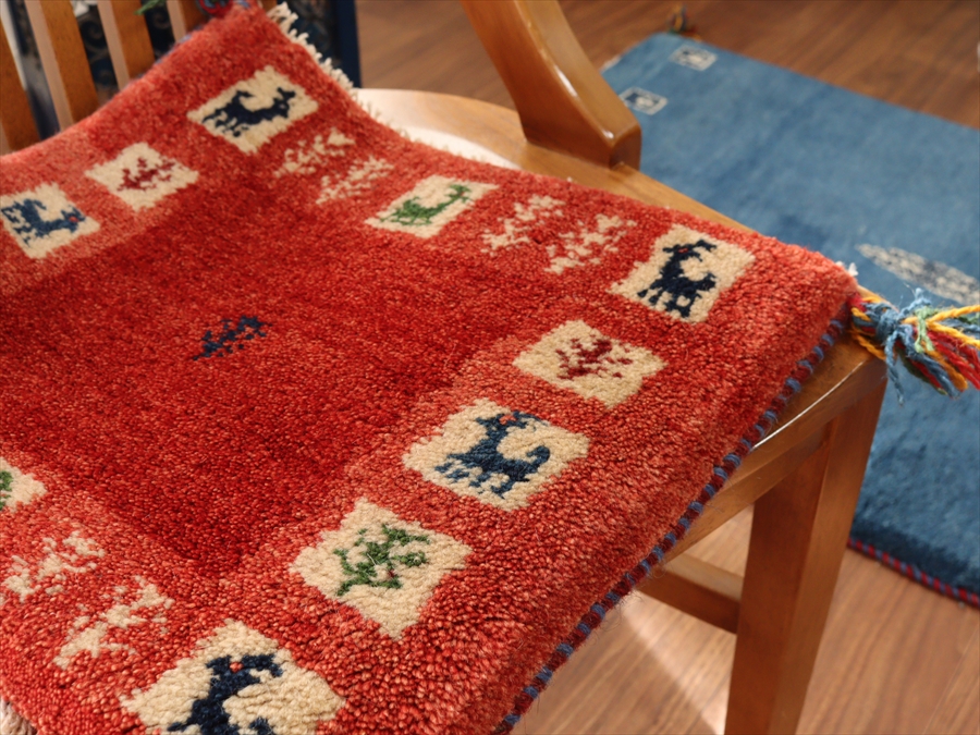 何枚も集めたくなる、40cm角の座布団サイズギャベ。四隅に大きなポンポンのついた、伝統的なスタイルでおられています。フローリングに並べて座布団がわりに使ったり、ベンチやダイニングチェアの座面など、使い方はいろいろ。壁にタペストリーのように飾るのもおすすめです。