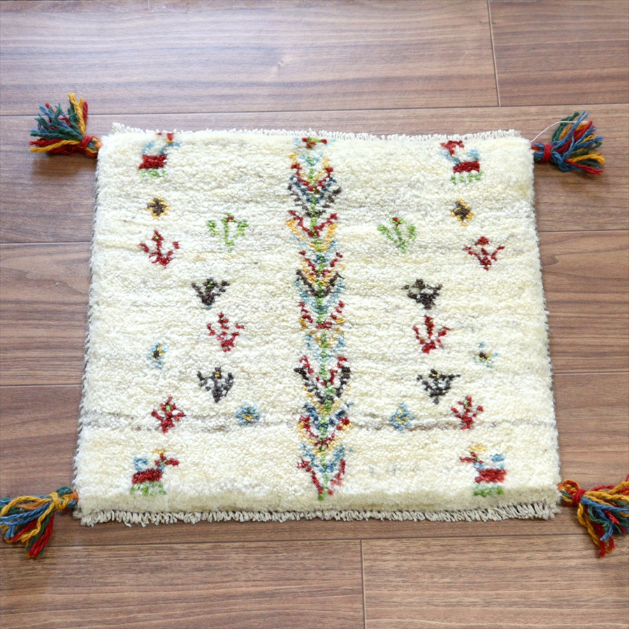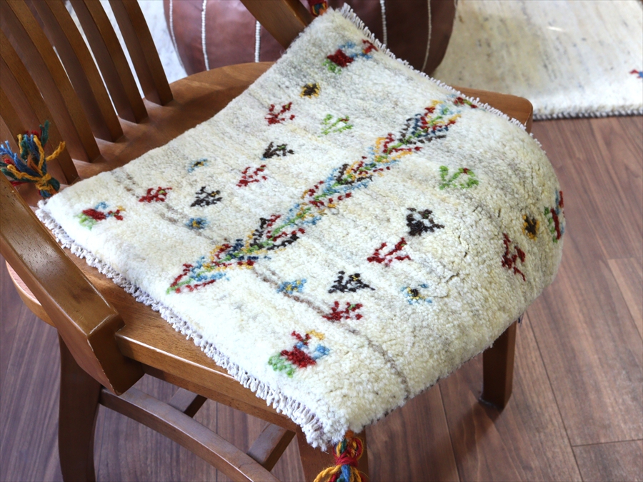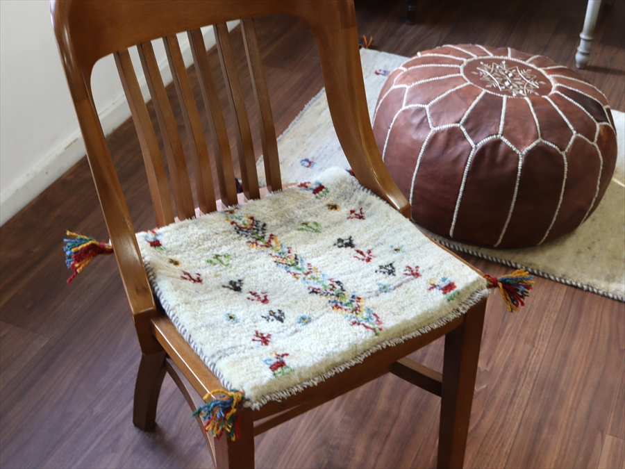 何枚も集めたくなる、40cm角の座布団サイズギャベ。四隅に大きなポンポンのついた、伝統的なスタイルでおられています。フローリングに並べて座布団がわりに使ったり、ベンチやダイニングチェアの座面など、使い方はいろいろ。壁にタペストリーのように飾るのもおすすめです。