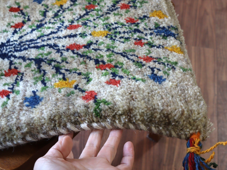 毛足の長いギャッベの中でも、かなりボリューム感のある分厚い織りです。パイル(毛足)と下地を合わせた厚みは2.4-2.5cmほど。