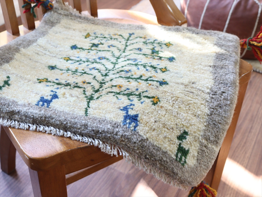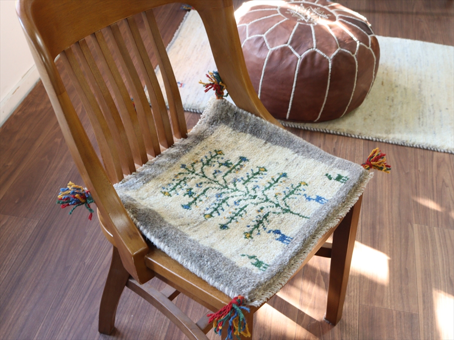何枚も集めたくなる、40cm角の座布団サイズギャベ。四隅に大きなポンポンのついた、伝統的なスタイルでおられています。フローリングに並べて座布団がわりに使ったり、ベンチやダイニングチェアの座面など、使い方はいろいろ。壁にタペストリーのように飾るのもおすすめです。