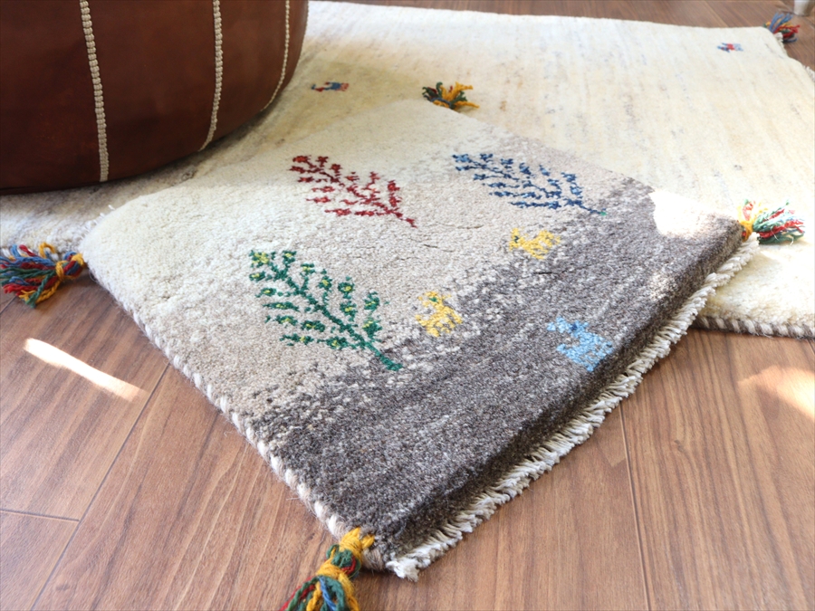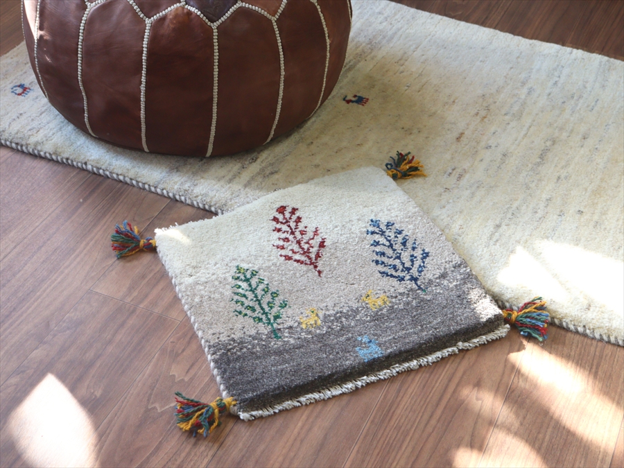 何枚も集めたくなる、40cm角の座布団サイズギャベ。四隅に大きなポンポンのついた、伝統的なスタイルでおられています。フローリングに並べて座布団がわりに使ったり、ベンチやダイニングチェアの座面など、使い方はいろいろ。壁にタペストリーのように飾るのもおすすめです。