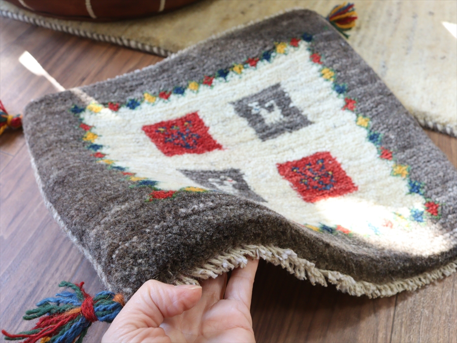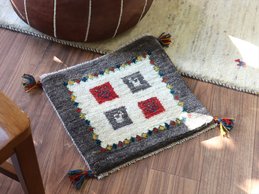 何枚も集めたくなる、40cm角の座布団サイズギャベ。四隅に大きなポンポンのついた、伝統的なスタイルでおられています。フローリングに並べて座布団がわりに使ったり、ベンチやダイニングチェアの座面など、使い方はいろいろ。壁にタペストリーのように飾るのもおすすめです。