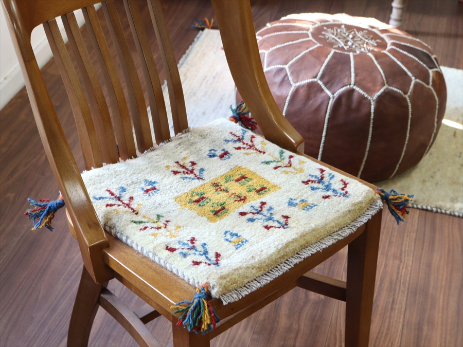 何枚も集めたくなる、40cm角の座布団サイズギャベ。四隅に大きなポンポンのついた、伝統的なスタイルでおられています。フローリングに並べて座布団がわりに使ったり、ベンチやダイニングチェアの座面など、使い方はいろいろ。壁にタペストリーのように飾るのもおすすめです。