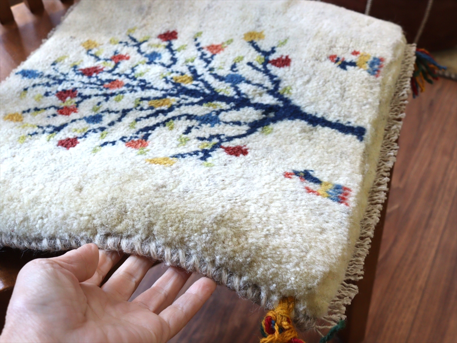 毛足が長くボリュームあるふっくらとした織り地のギャッベ。パイル(毛足)を含めた厚みは2.3-2.4cmほどで、分厚いという表現がぴったりの手織り絨毯です。