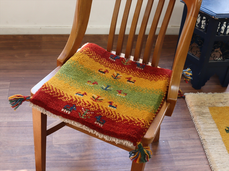 何枚も集めたくなる、40cm角の座布団サイズギャベ。四隅に大きなポンポンのついた、伝統的なスタイルでおられています。フローリングに並べて座布団がわりに使ったり、ベンチやダイニングチェアの座面など、使い方はいろいろ。壁にタペストリーのように飾るのもおすすめです。