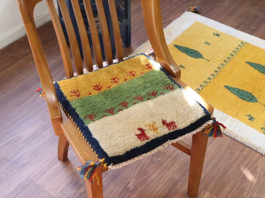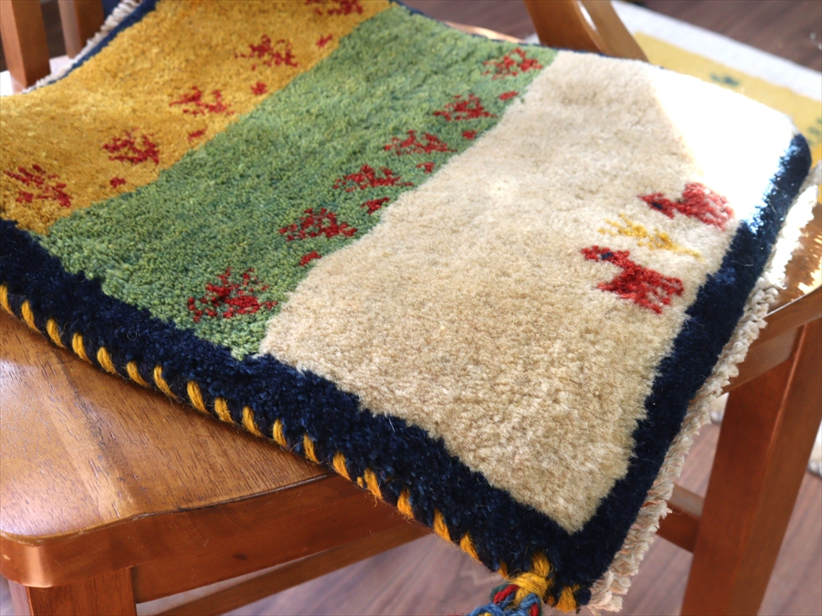 何枚も集めたくなる、40cm角の座布団サイズギャベ。四隅に大きなポンポンのついた、伝統的なスタイルでおられています。フローリングに並べて座布団がわりに使ったり、ベンチやダイニングチェアの座面など、使い方はいろいろ。壁にタペストリーのように飾るのもおすすめです。