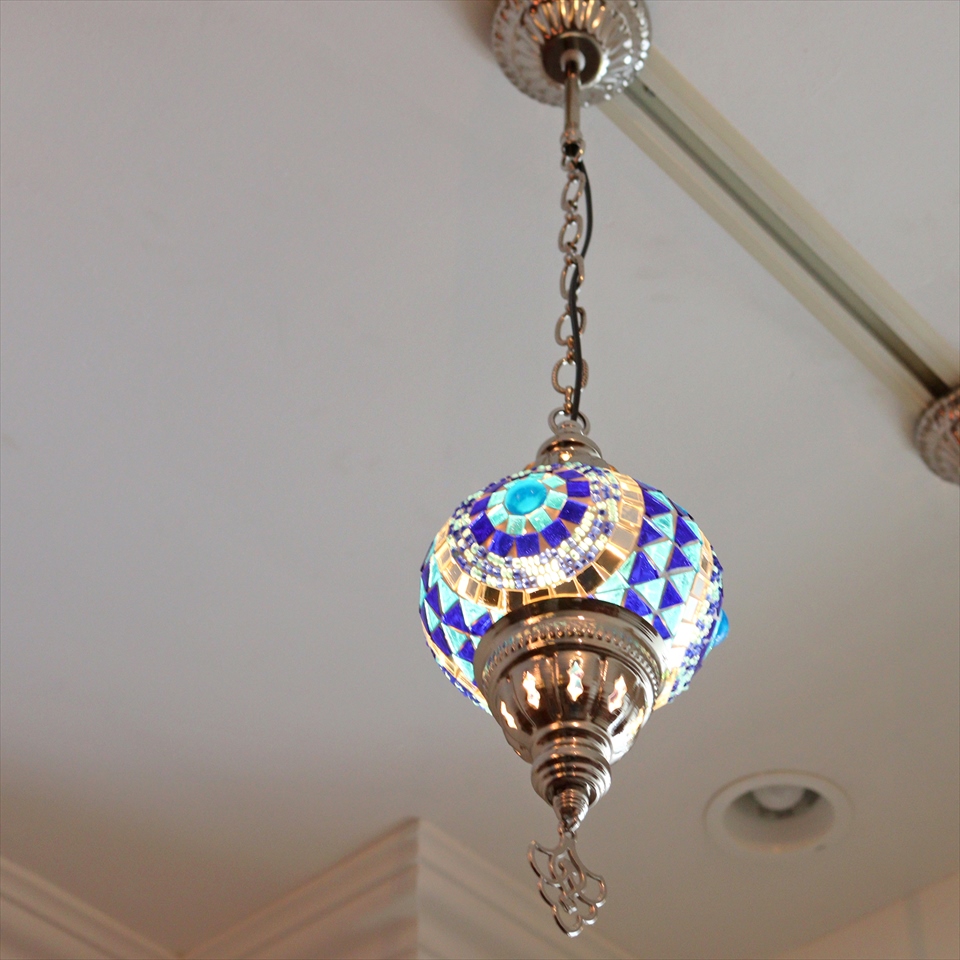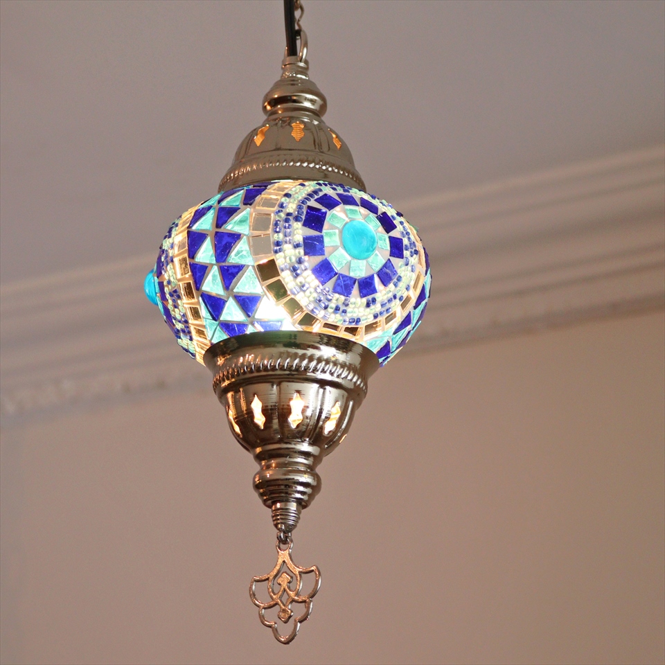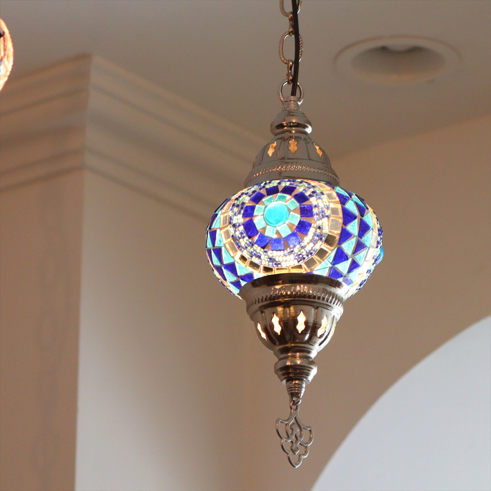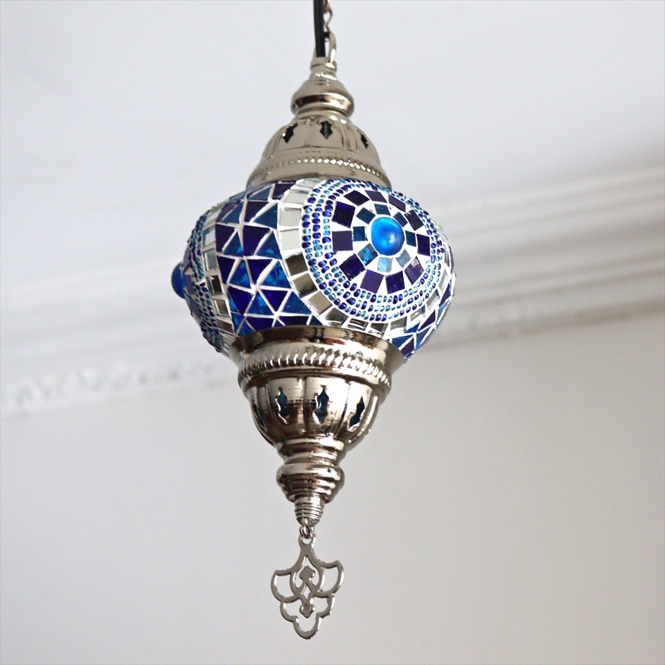 トルコランプ モザイクペンダントランプ 直径13cm 全高67cm ブルー シルバーカラーの灯具