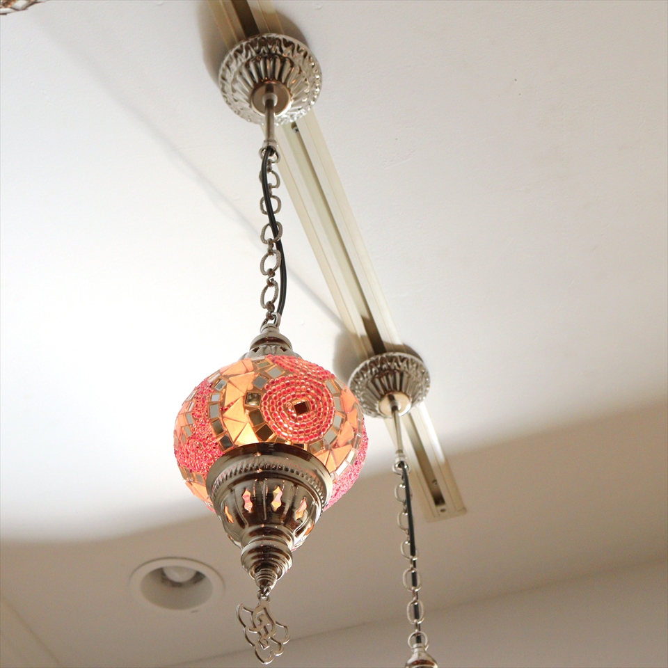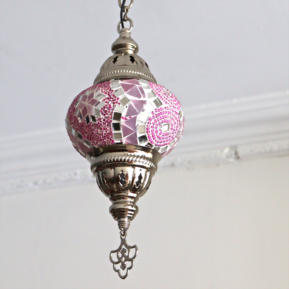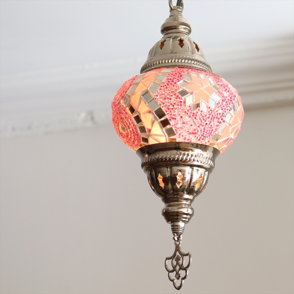 トルコランプ モザイクペンダントランプ 直径13cm 全高67cm ピンク シルバーカラーの灯具