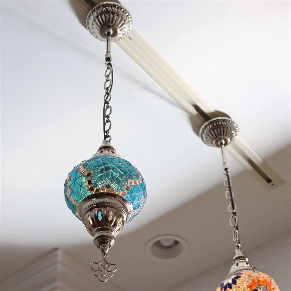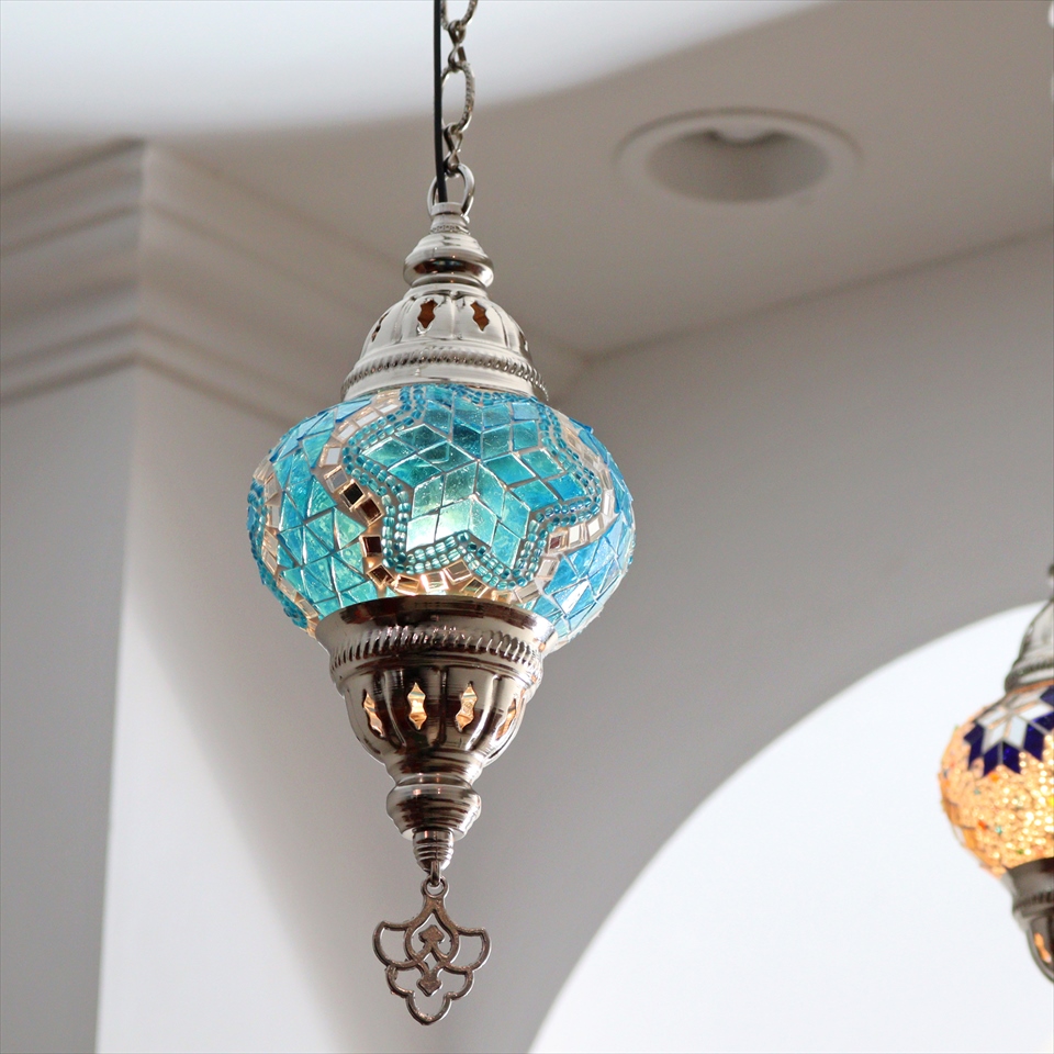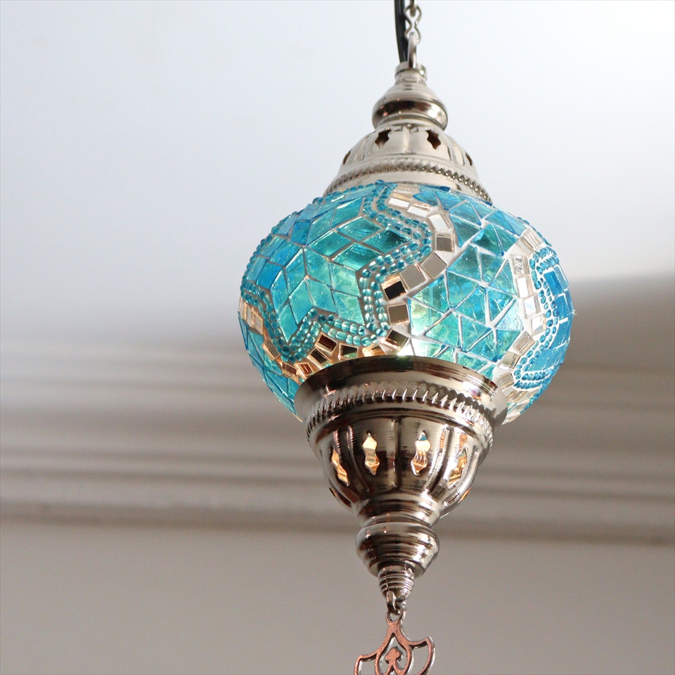 トルコランプ モザイクペンダントランプ 直径13cm 全高67cm ターコイズブルー シルバーカラーの灯具