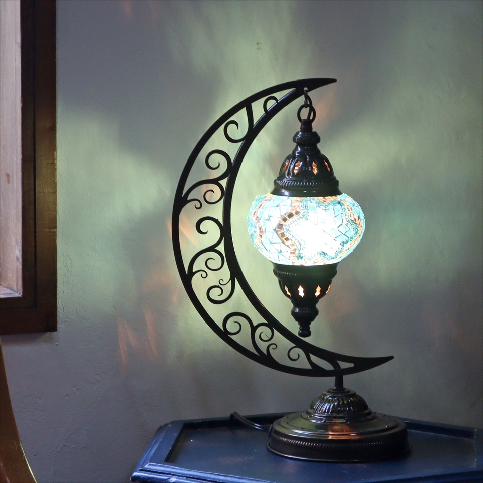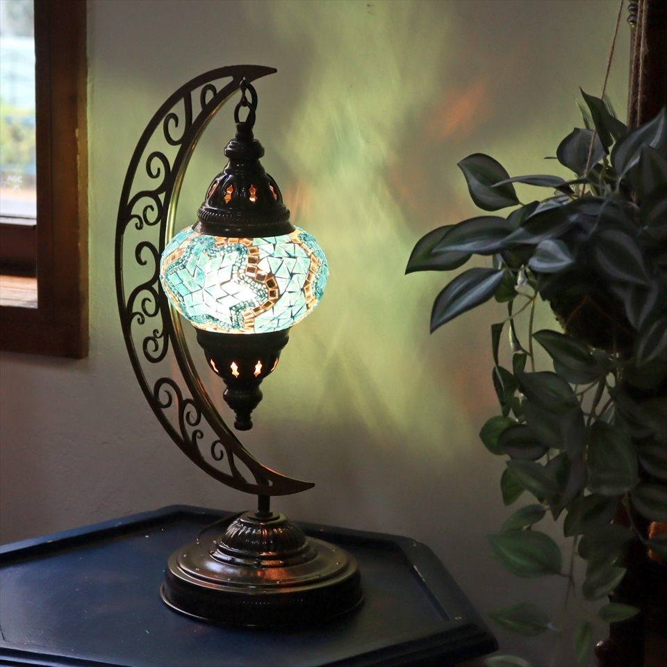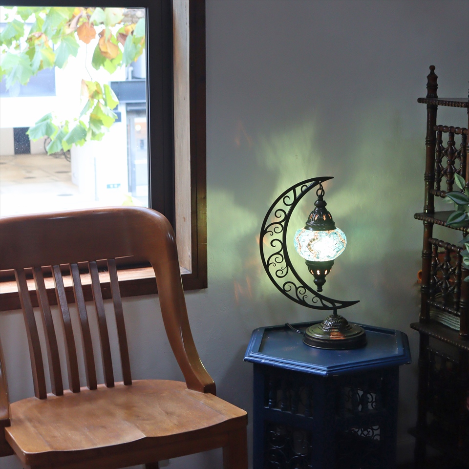 トルコランプ モザイクテーブルランプ クレッセントムーン 高さ41cm ターコイズブルー