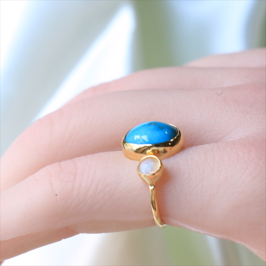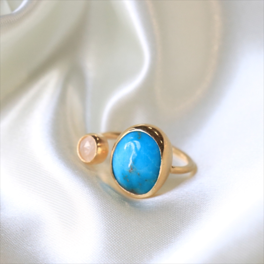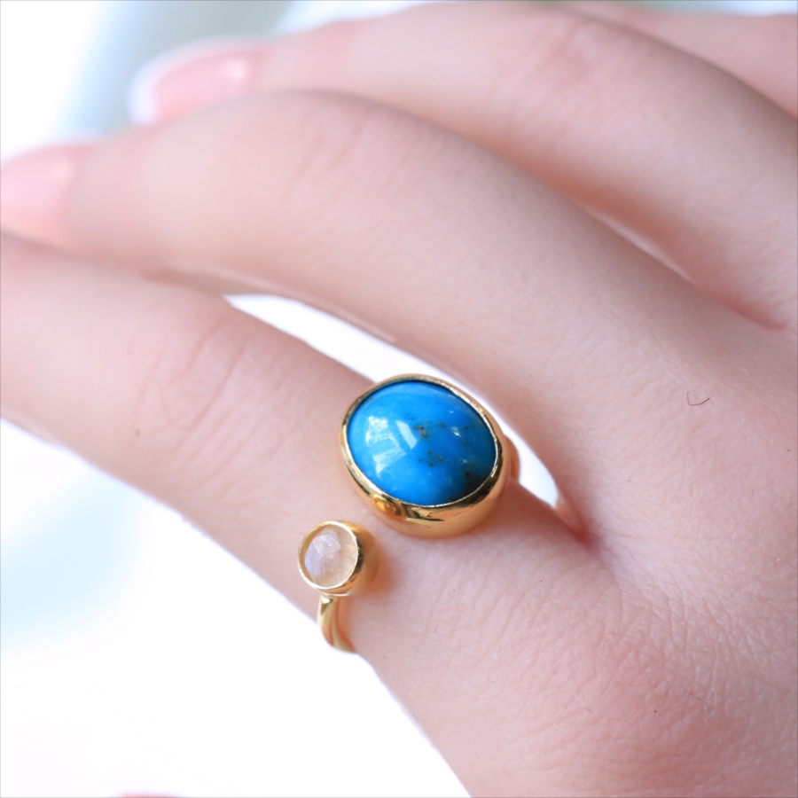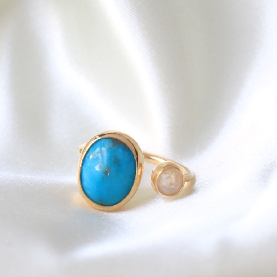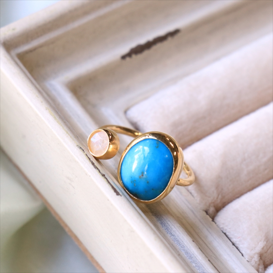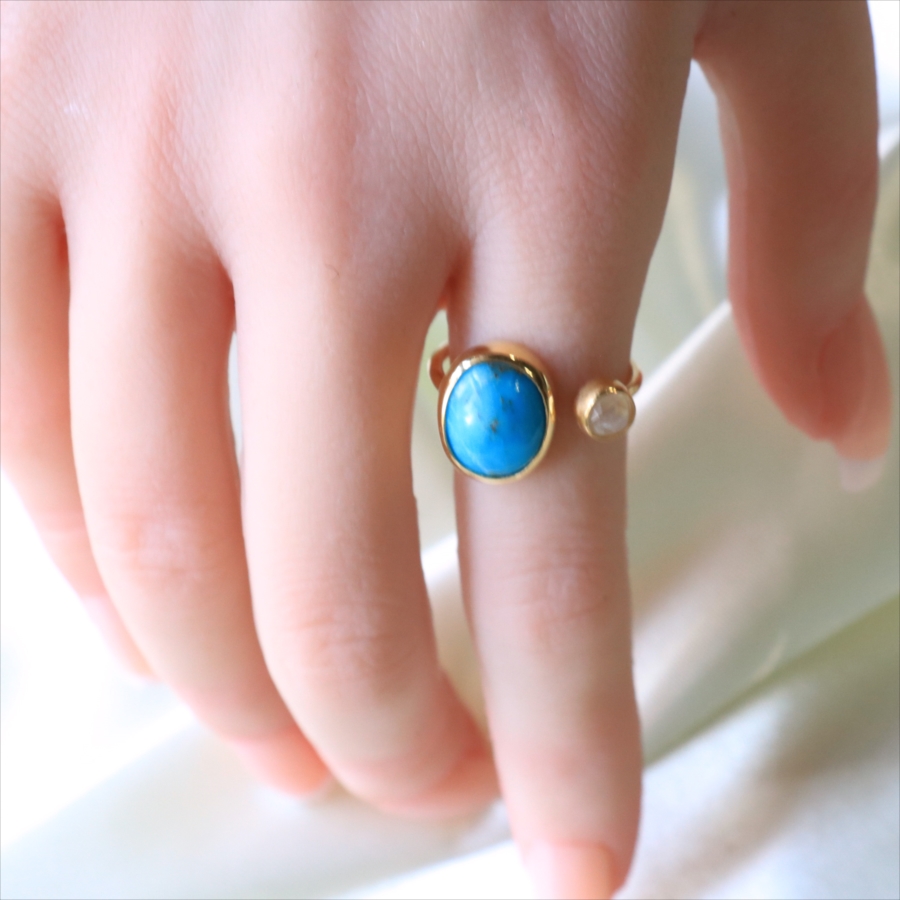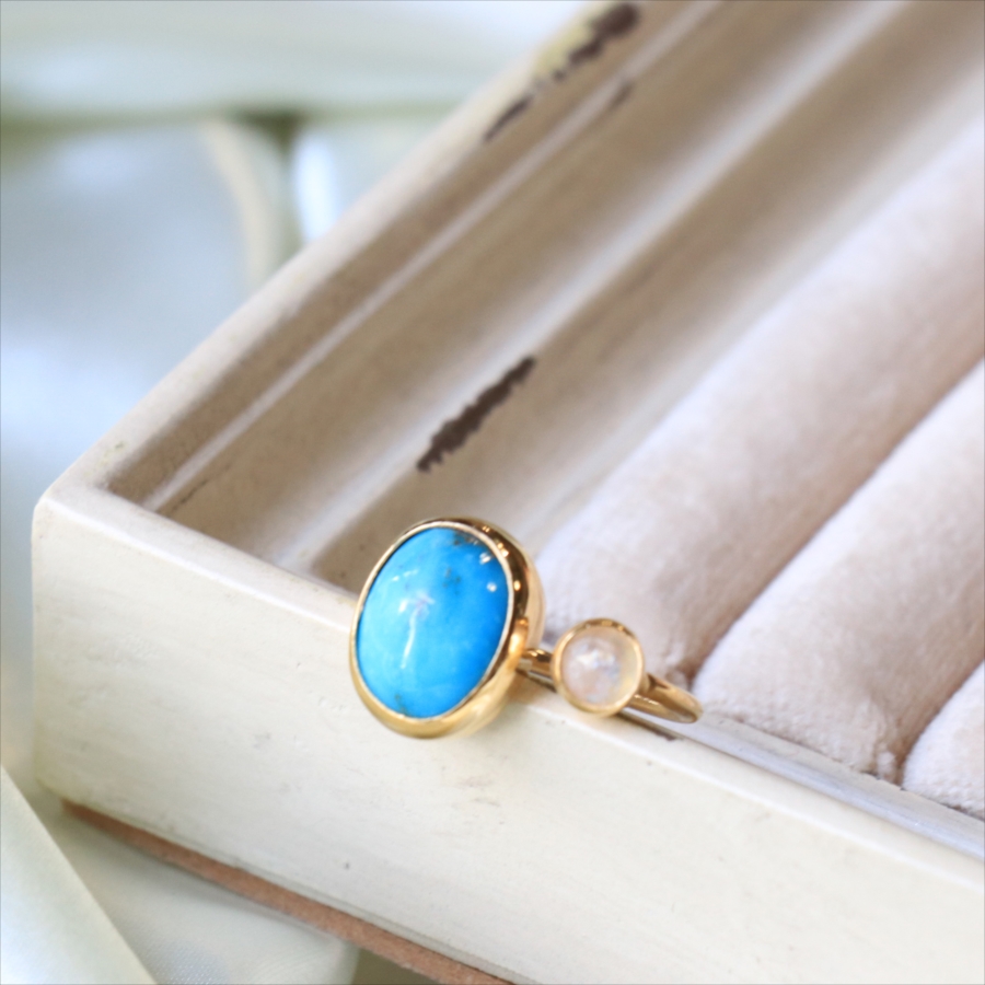 原石の雰囲気をそのままに大粒のマットなブルーカラーのターコイズに寄り添うコロンとしたムーンストーン。ゴールドカラーとの相性が良く上品な印象です。