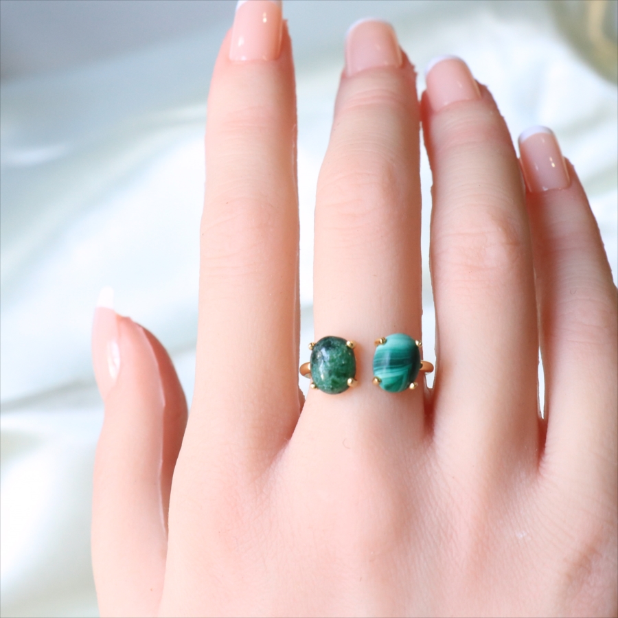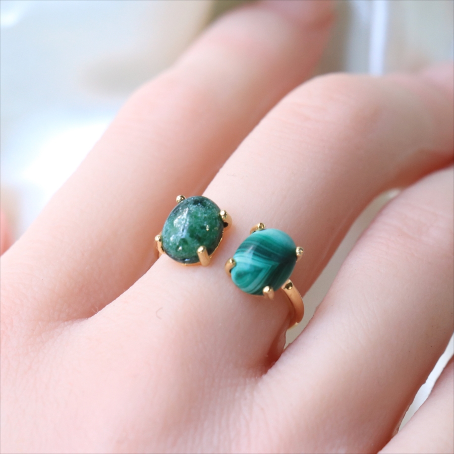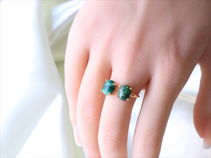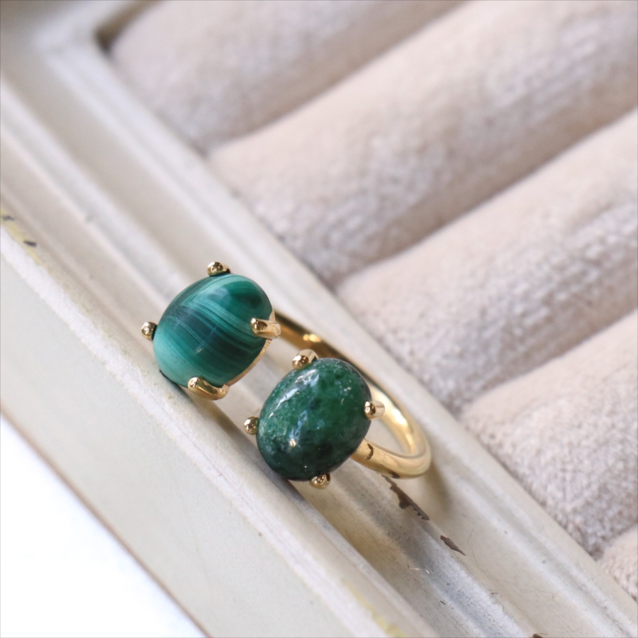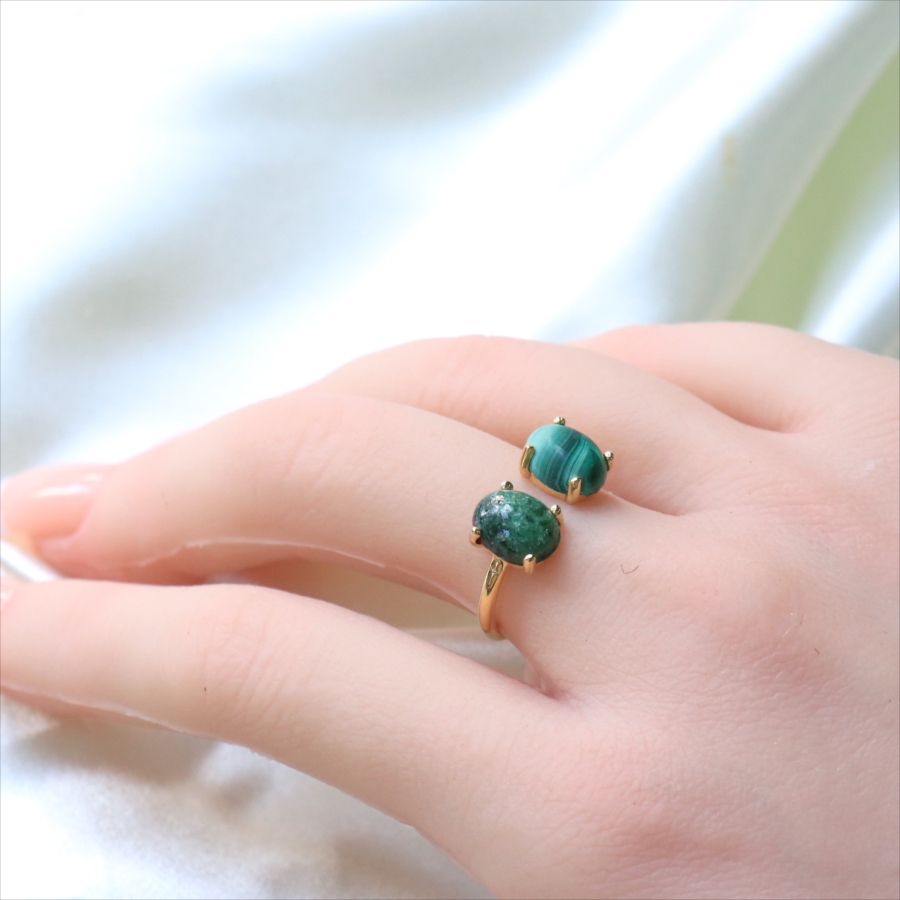 グリーンカラーの個性的な異なる石が二つ寄り添うように並んだリングです。マラカイトの波打つような美しいマーブル模様が神秘的で目を惹きつけます。ゴールドカラーのアームが見えないため、まるで指に二つの石がちょこんとのっているようなかわいらしいデザインです。※石約0.8×0.6㎝