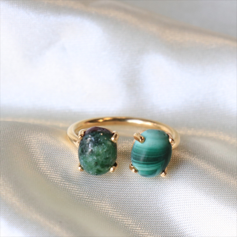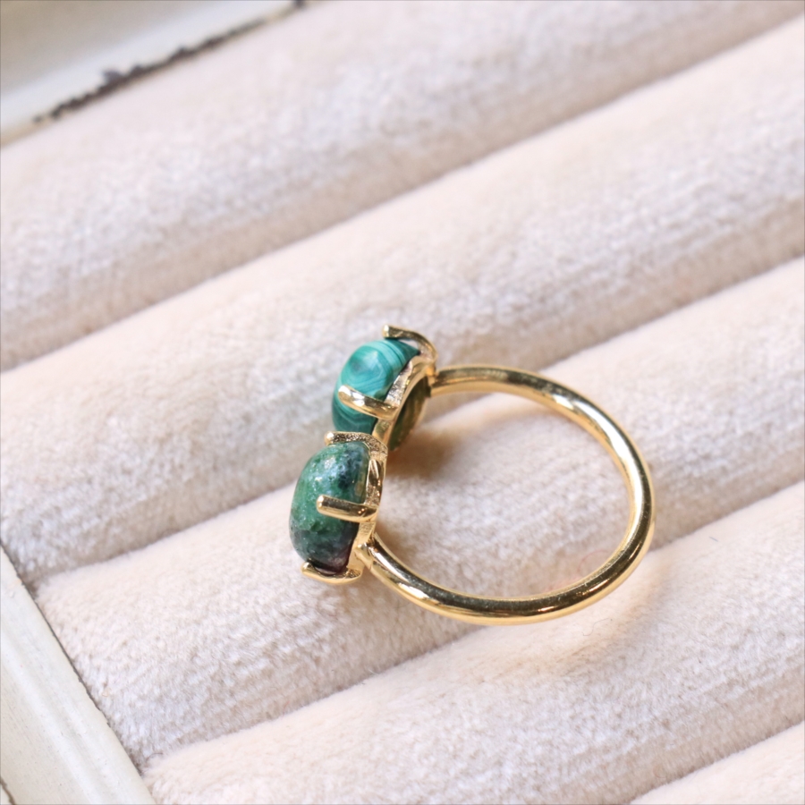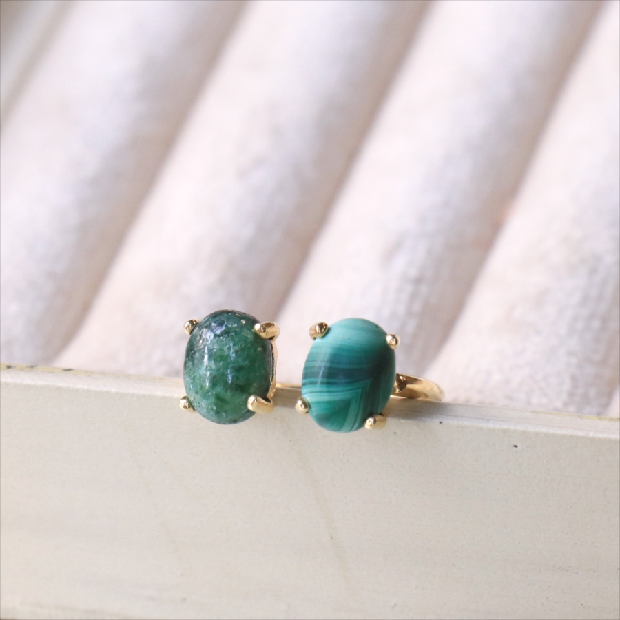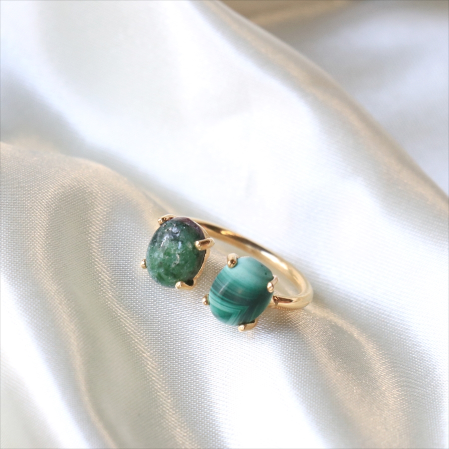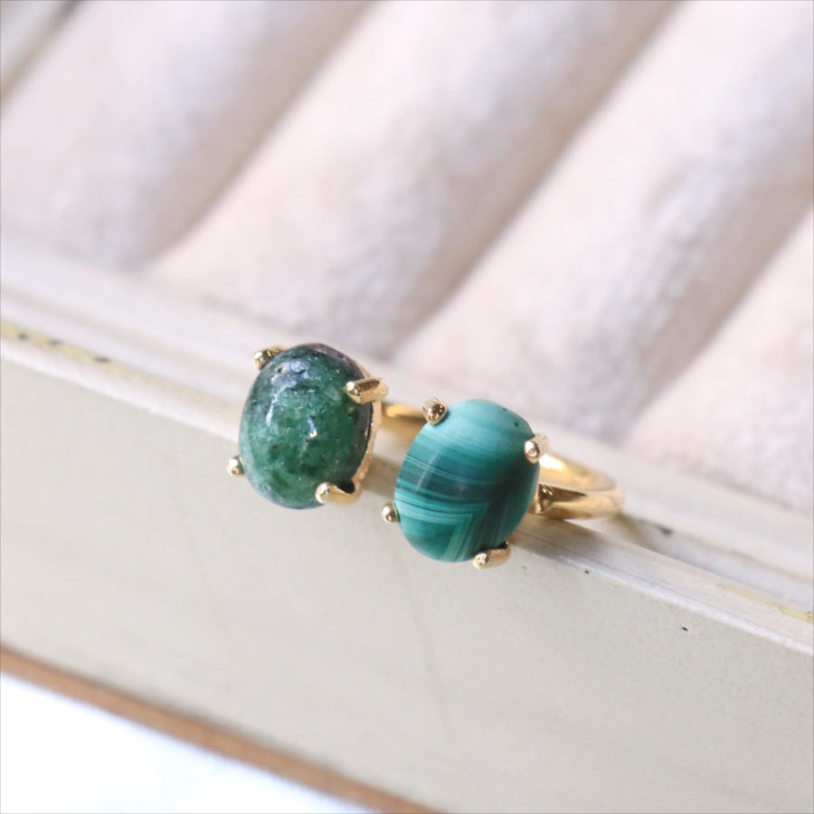 グリーンカラーの個性的な異なる石が二つ寄り添うように並んだリングです。マラカイトの波打つような美しいマーブル模様が神秘的で目を惹きつけます。ゴールドカラーのアームが見えないため、まるで指に二つの石がちょこんとのっているようなかわいらしいデザインです。※石約0.8×0.6㎝