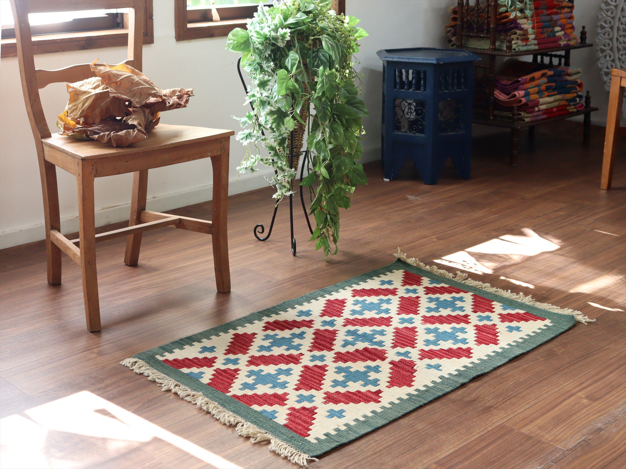 6-7mm程度の厚みがあり、パイル(毛足)がない平織りの敷物で表面は少しザラっとした肌ざわりです。織り手の自由なアイデアでデザインされていますので、左右対象でなかったり、モチーフが少しずれていたりということもありますが、世界で一枚だけの作品ですからその点はご了承ください。
