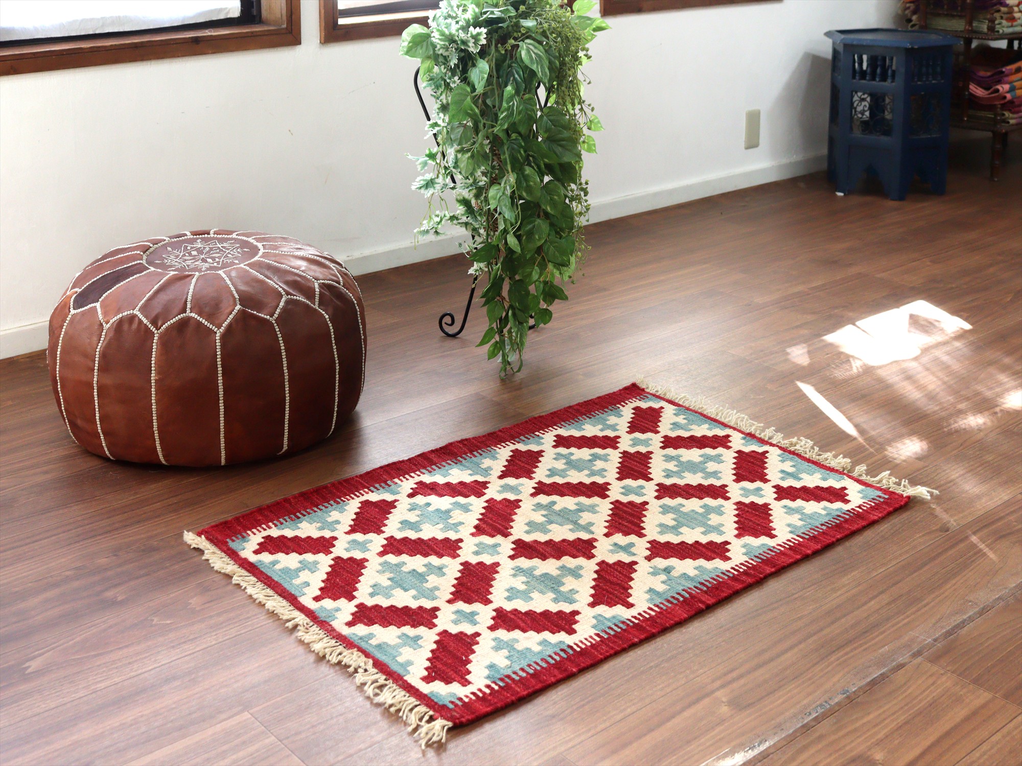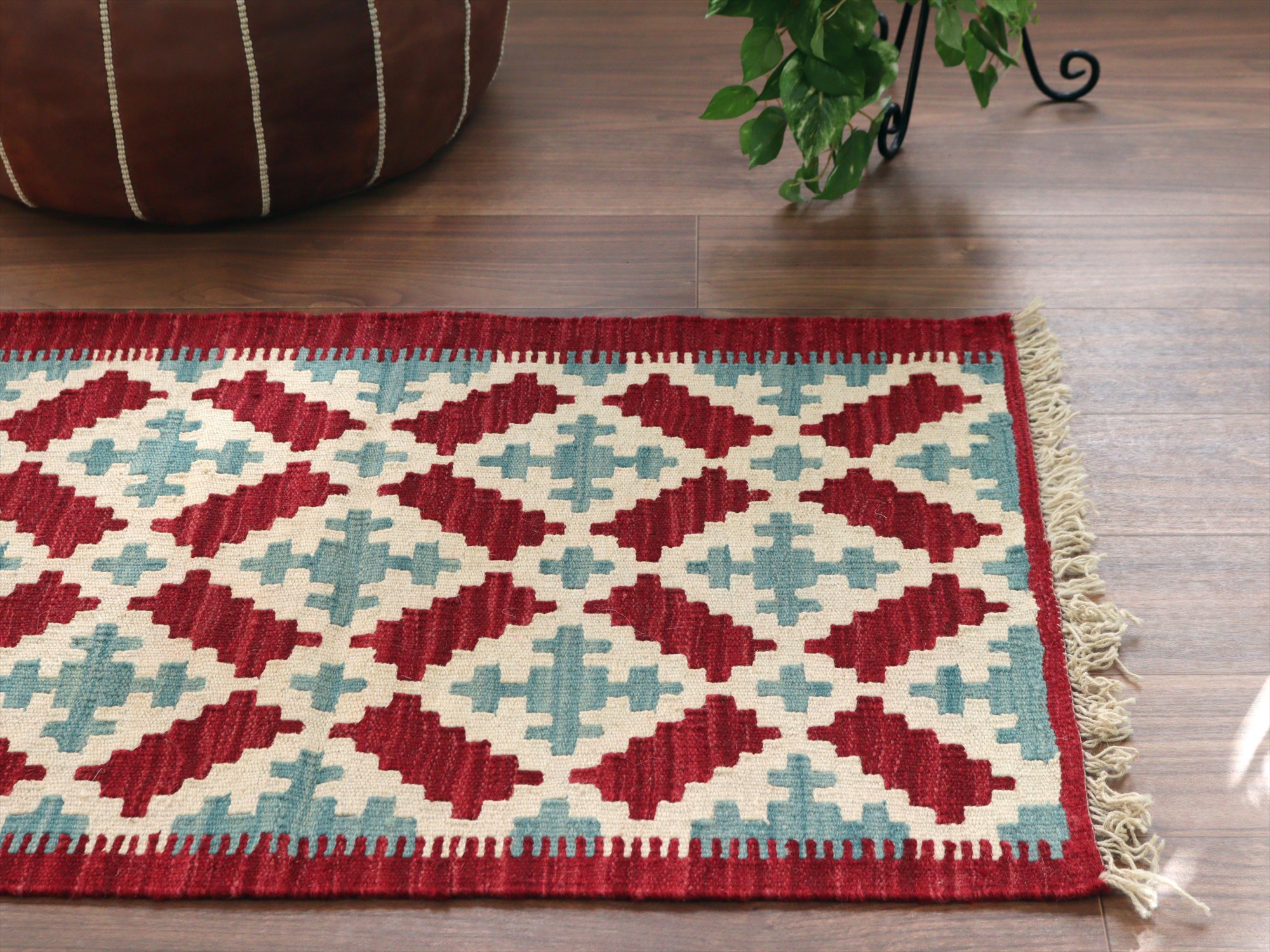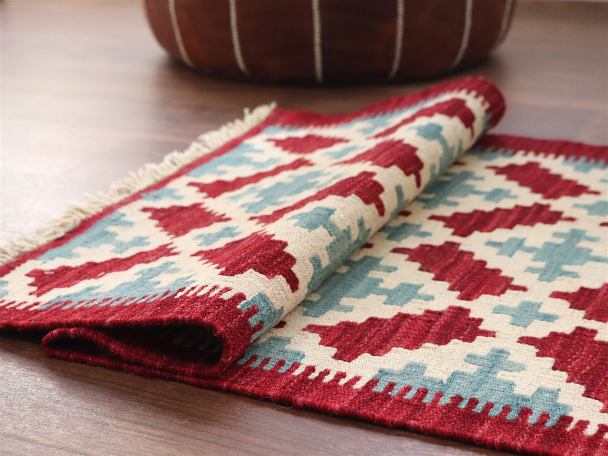 6-7mm程度の厚みがあり、パイル(毛足)がない平織りの敷物で表面は少しザラっとした肌ざわりです。織り手の自由なアイデアでデザインされていますので、左右対象でなかったり、モチーフが少しずれていたりということもありますが、世界で一枚だけの作品ですからその点はご了承ください。