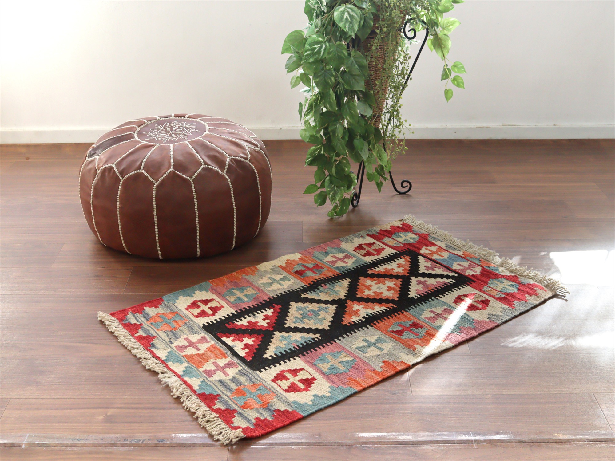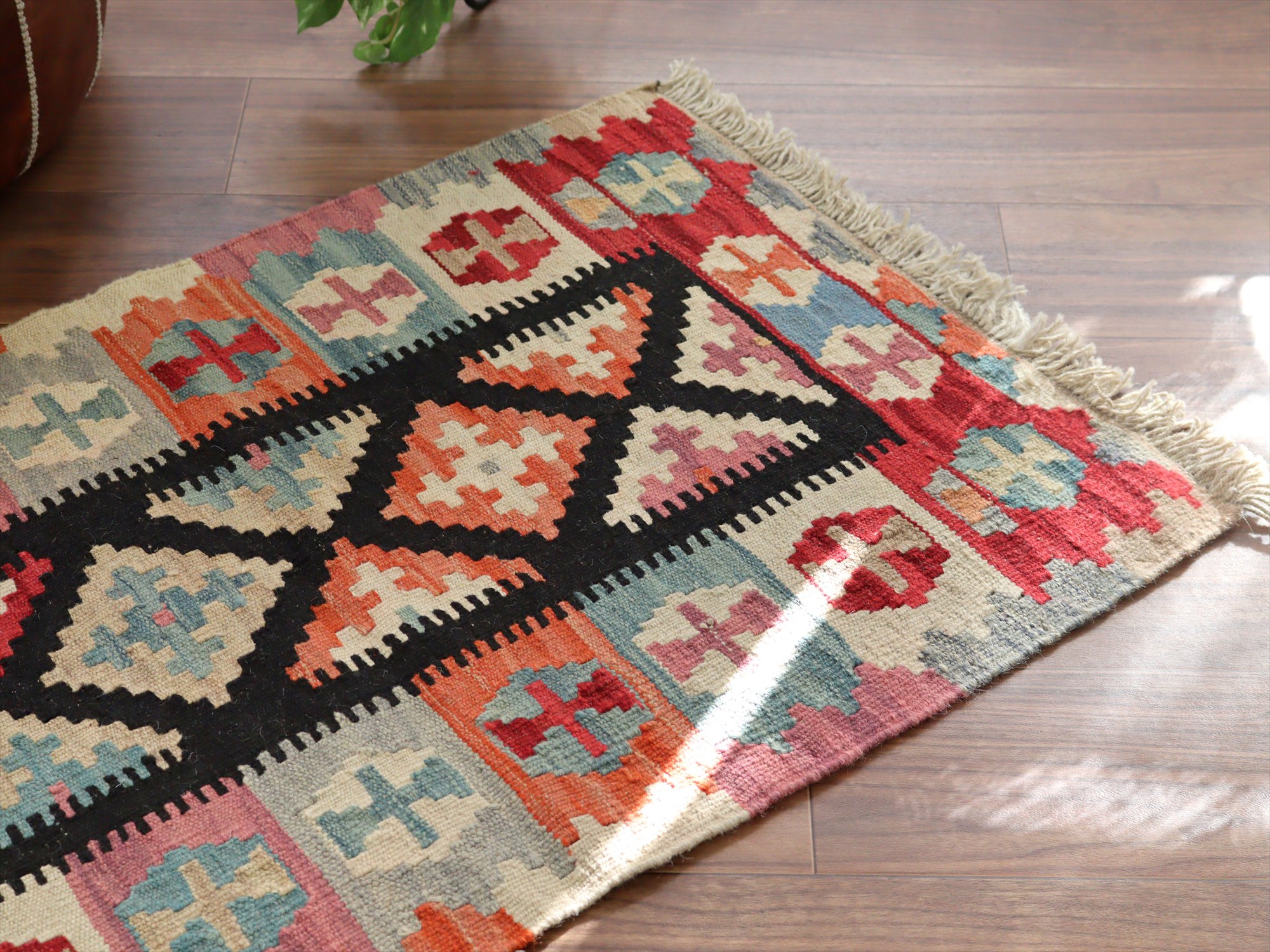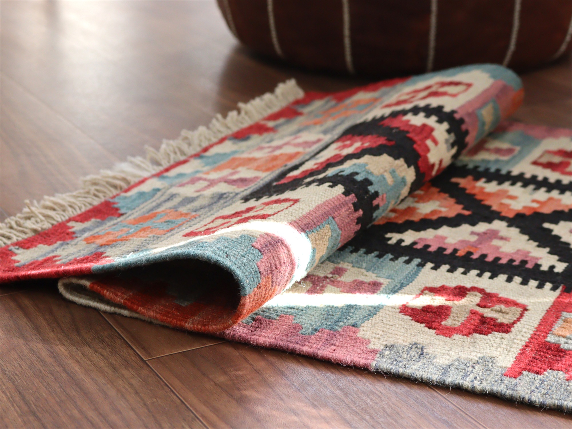 6-7mm程度の厚みがあり、パイル(毛足)がない平織りの敷物で表面は少しザラっとした肌ざわりです。織り手の自由なアイデアでデザインされていますので、左右対象でなかったり、モチーフが少しずれていたりということもありますが、世界で一枚だけの作品ですからその点はご了承ください。